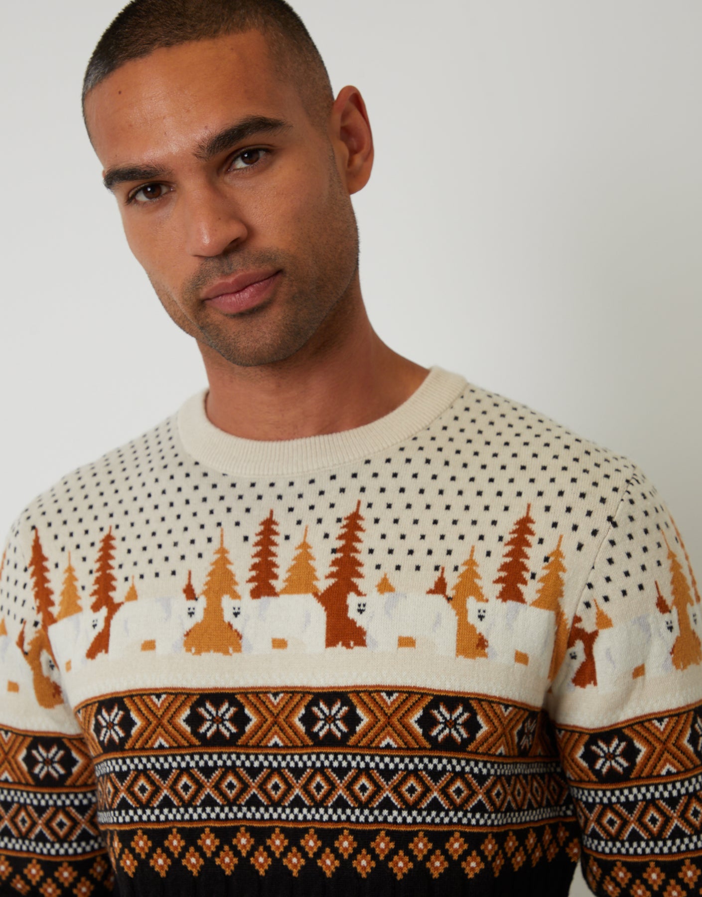 - Festive polar bear fairisle jacquard knit pattern across chest, back and arms