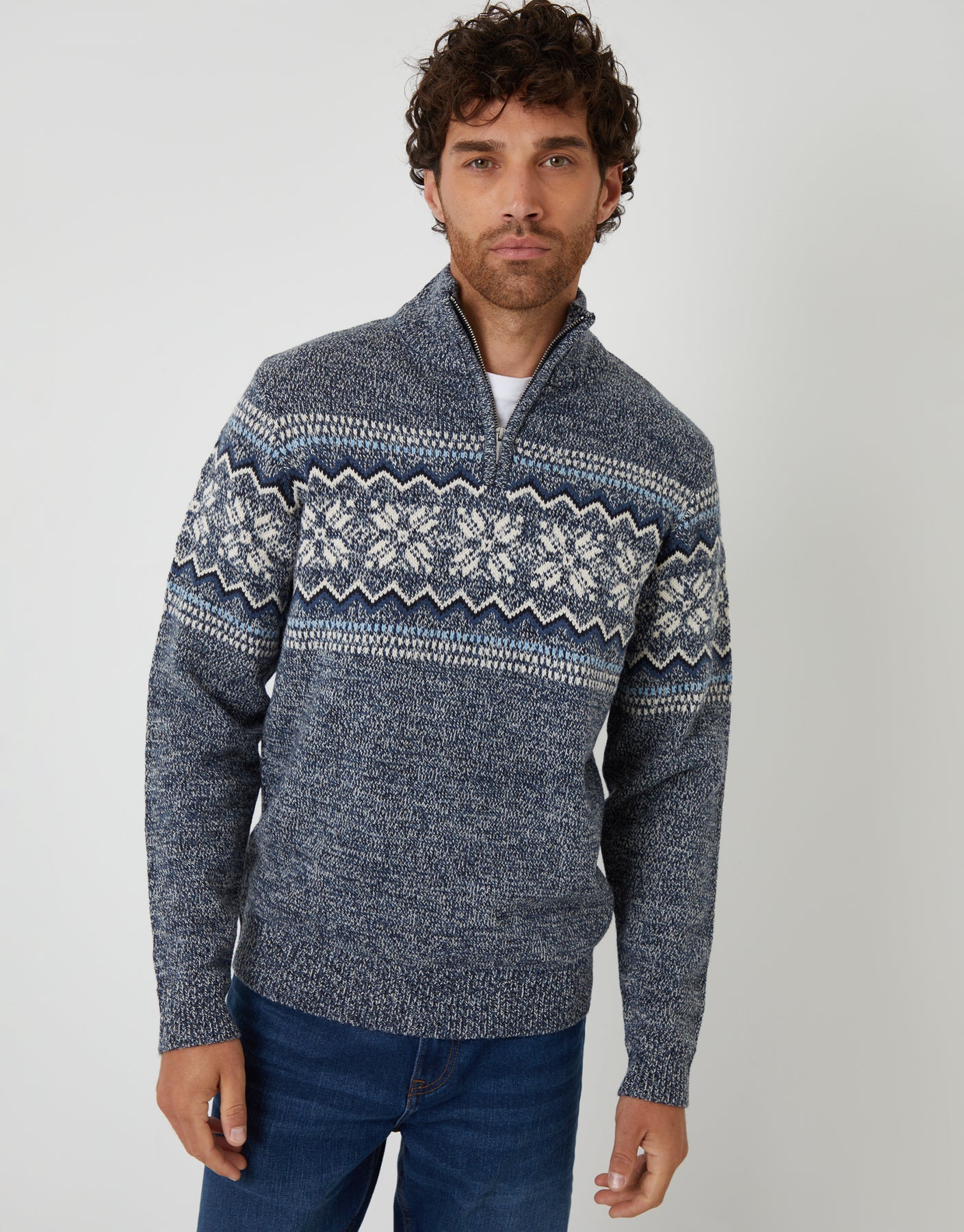 Upgrade your knitwear with this winter fairisle quarter zip jumper from Threadbare.