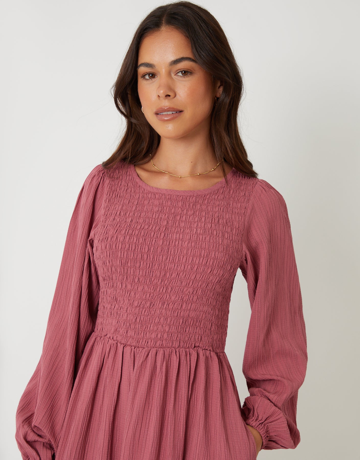 Pink Textured Shirred Balloon Sleeve Midi Dress