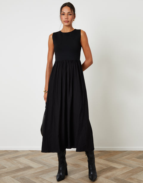 Black Puff Sleeve Jersey Poplin Mix Maxi Dress