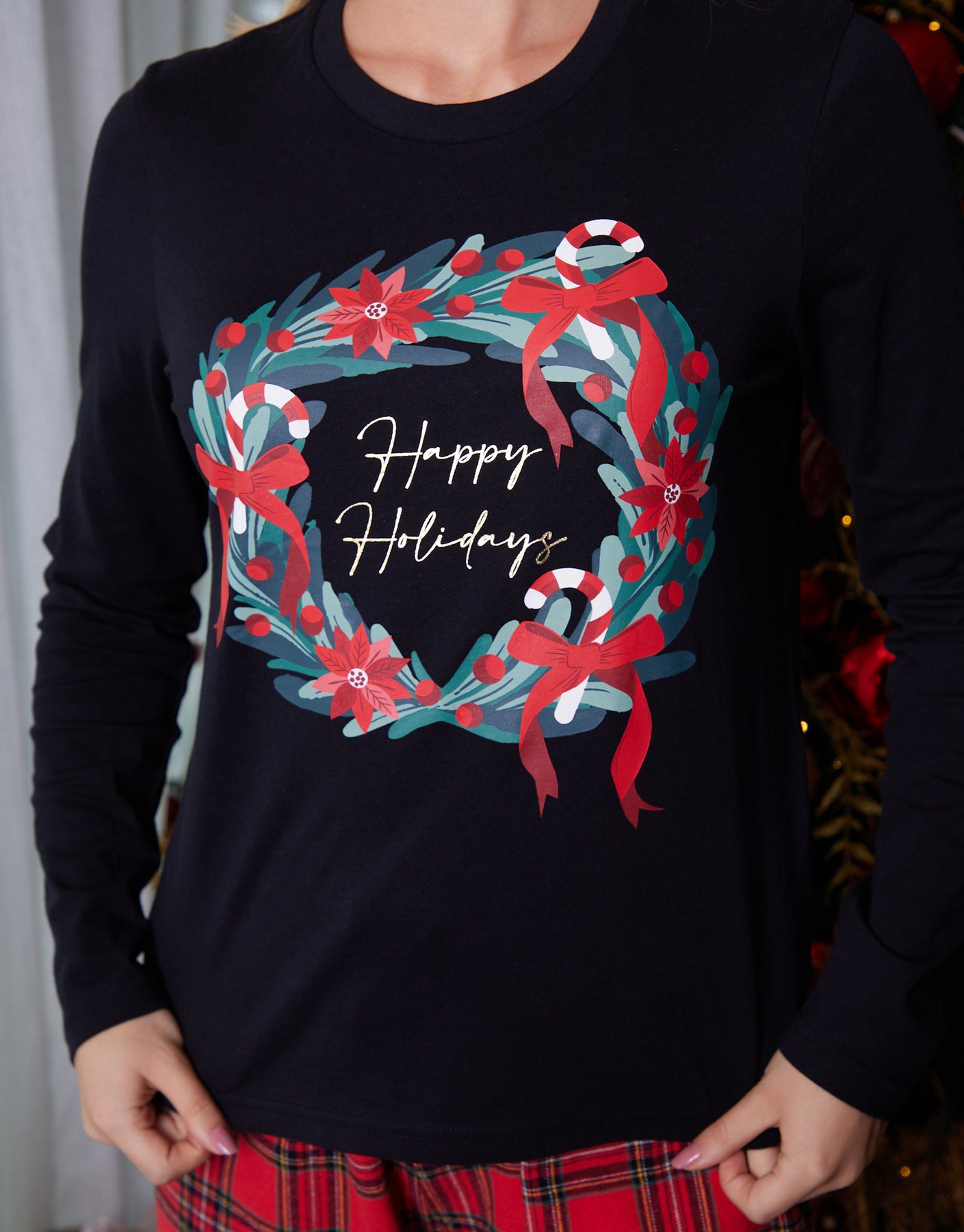 Black Christmas Wreath Long Pyjamas (2-Piece Set)
