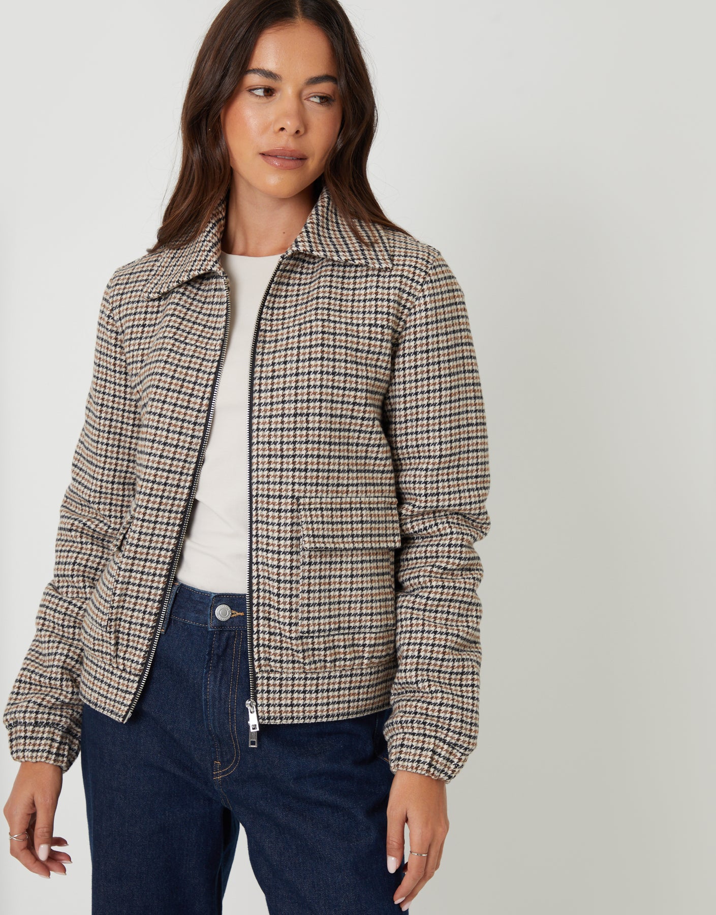 Brown Houndstooth Check Faux Wool Jacket