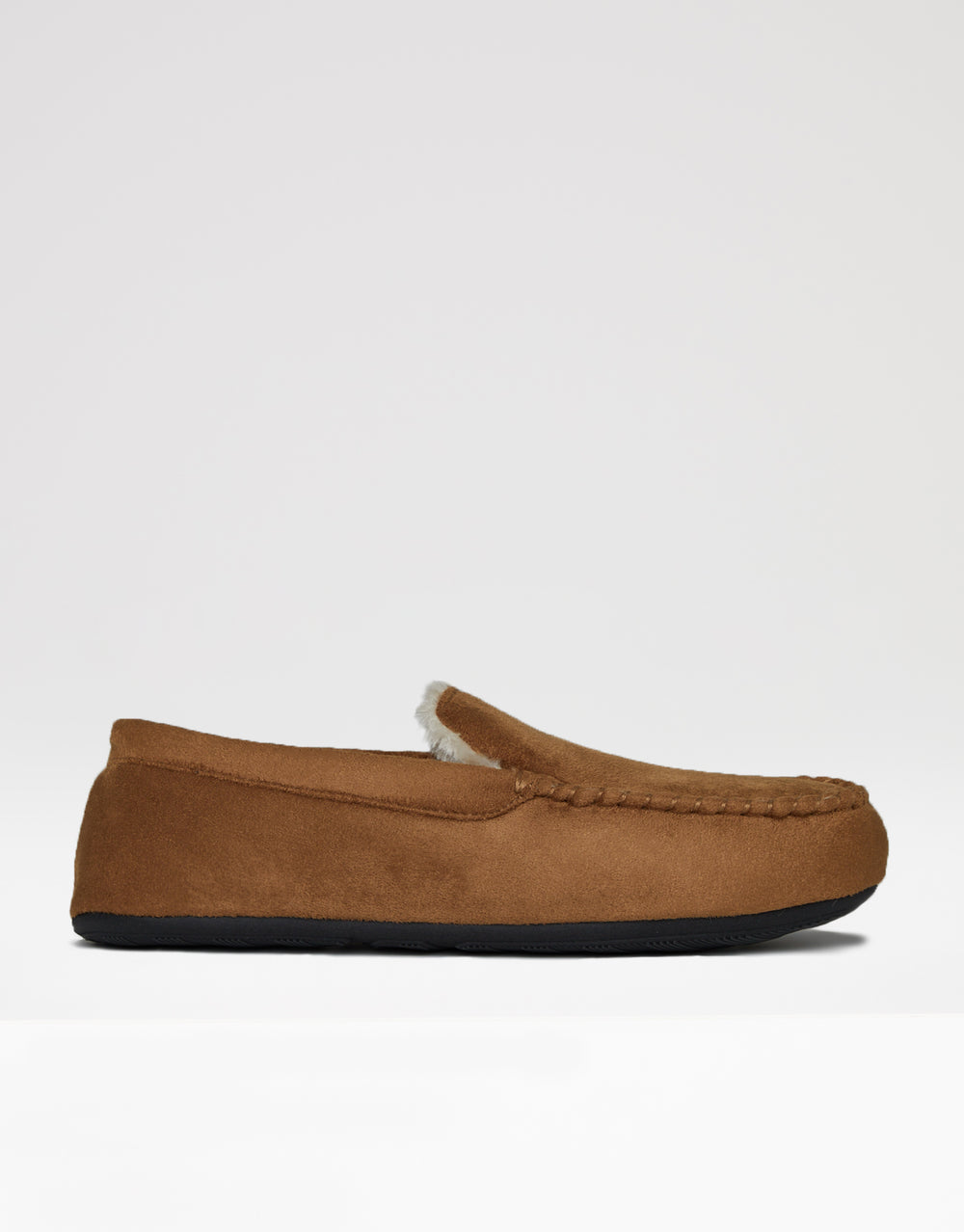 Tan Brown Suedette Moccasin Slippers with Faux Fur Lining
