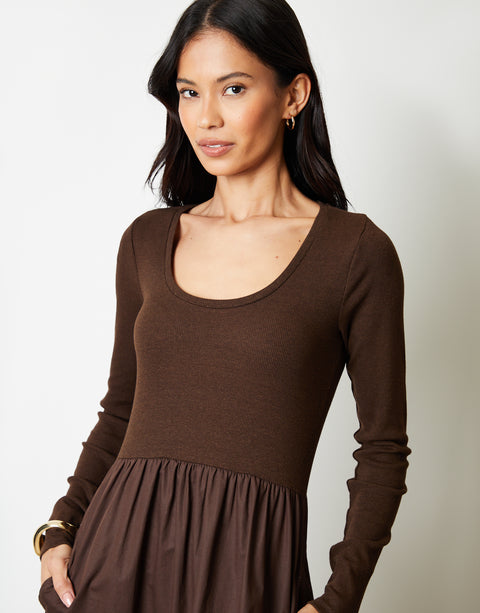 Chocolate Brown Rib Jersey 2-in-1 Midi Dress with Poplin Skirt