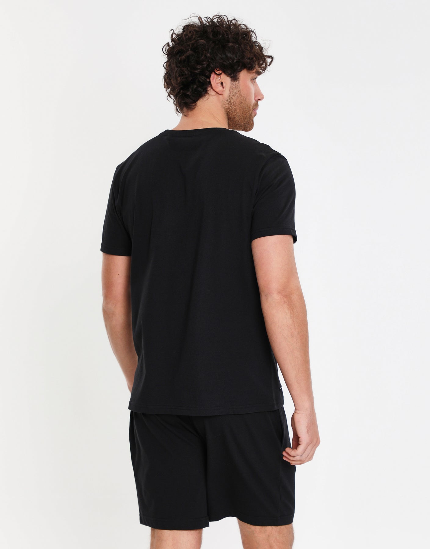 This two piece lounge set has a comfortable jersey t-shirt in black with short set-in sleeves, round neckline.
