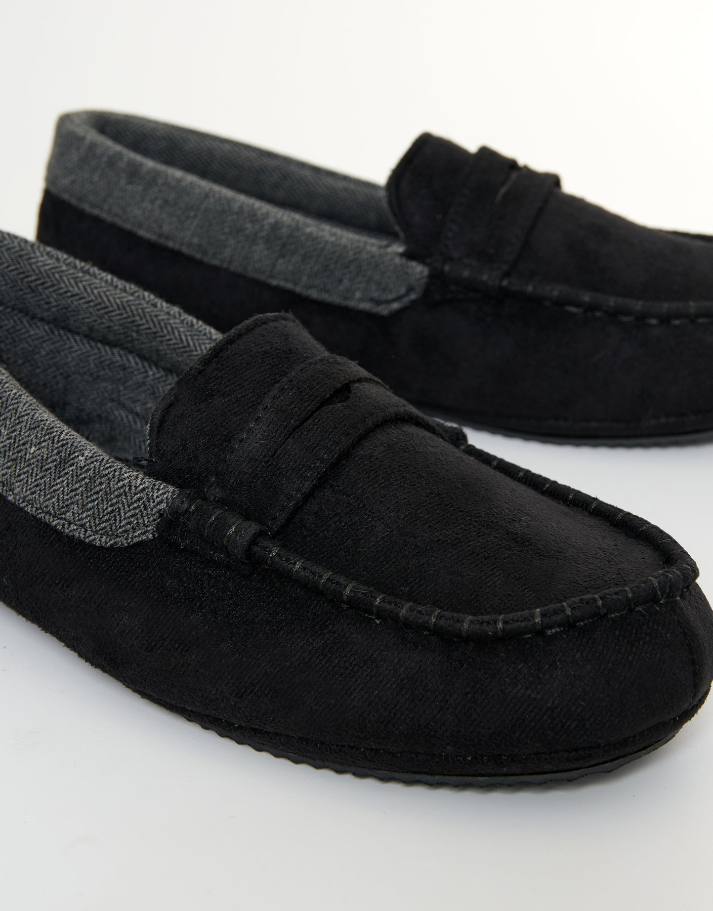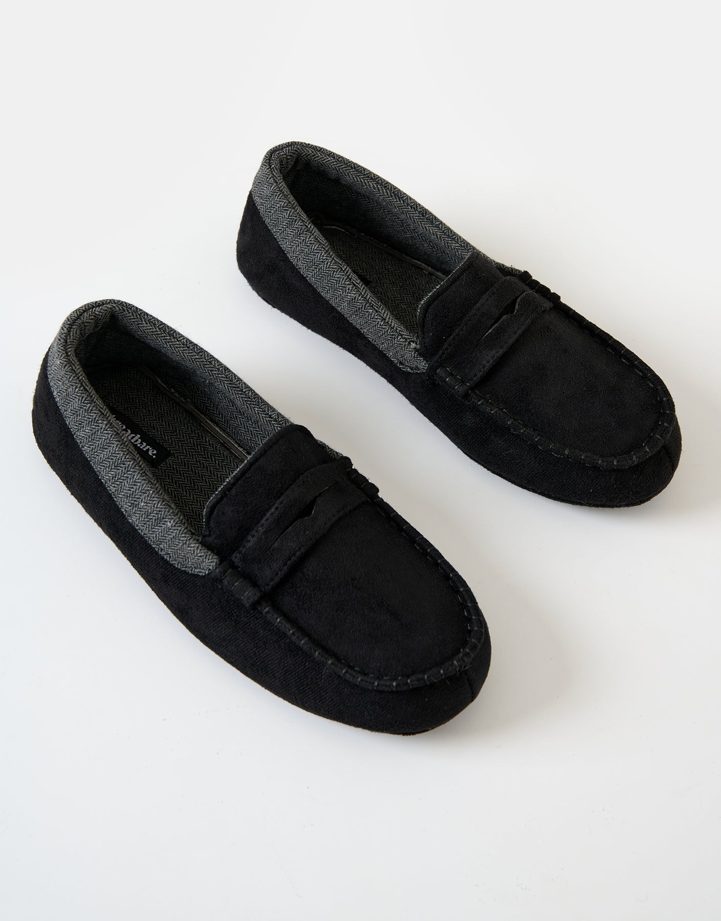 Black Faux Suede Fabric Trim Moccasin Slippers