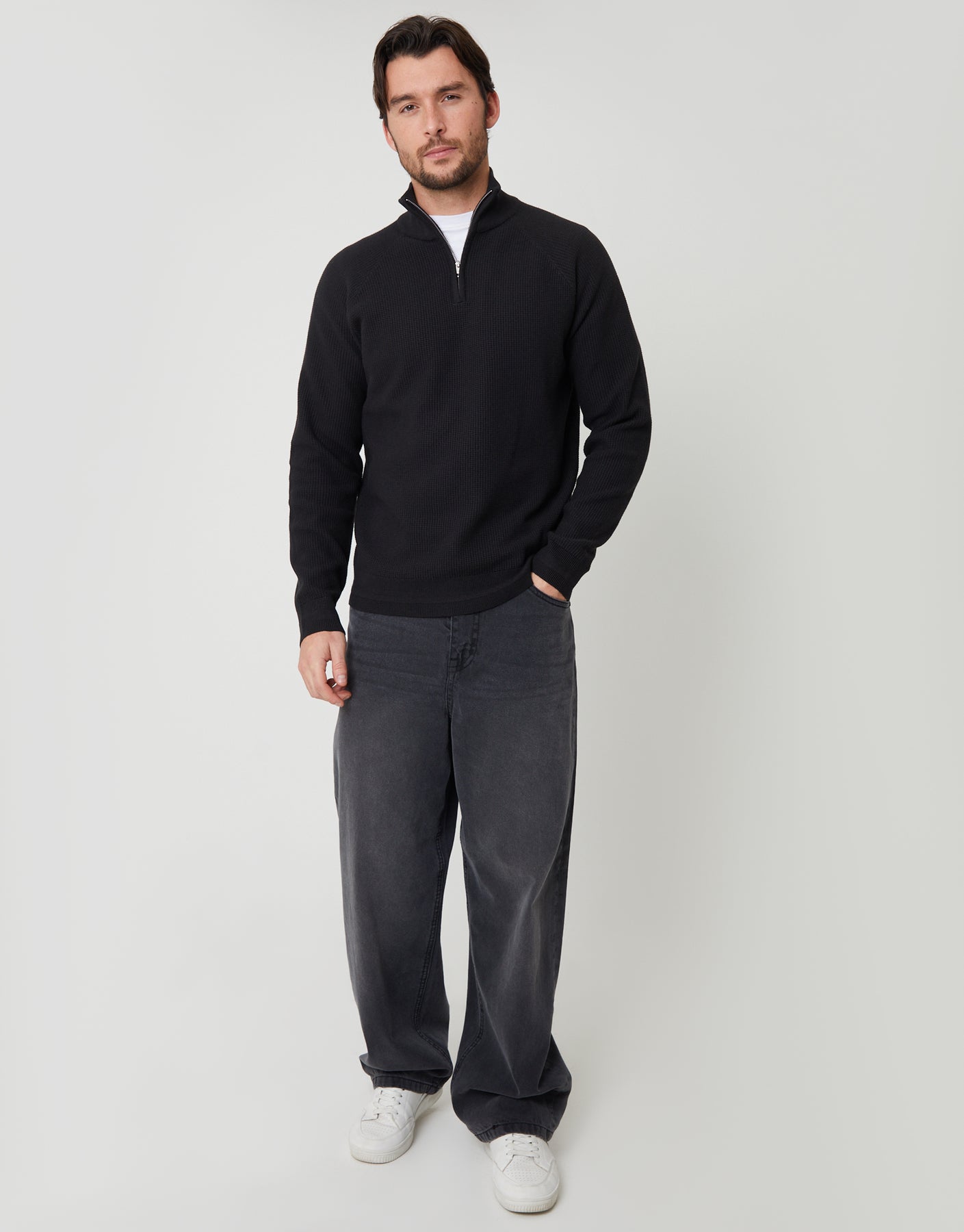 Black Waffle Knit Raglan Quarter Zip Jumper
