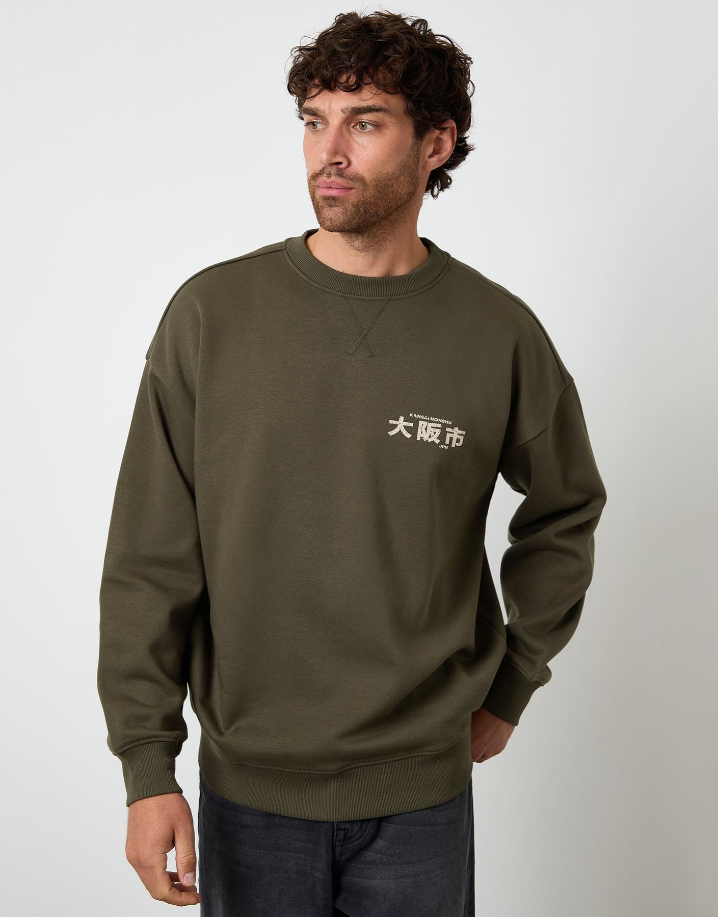 Dark Khaki Green Relaxed Fit Graphic Print Crew Neck Sweatshirt