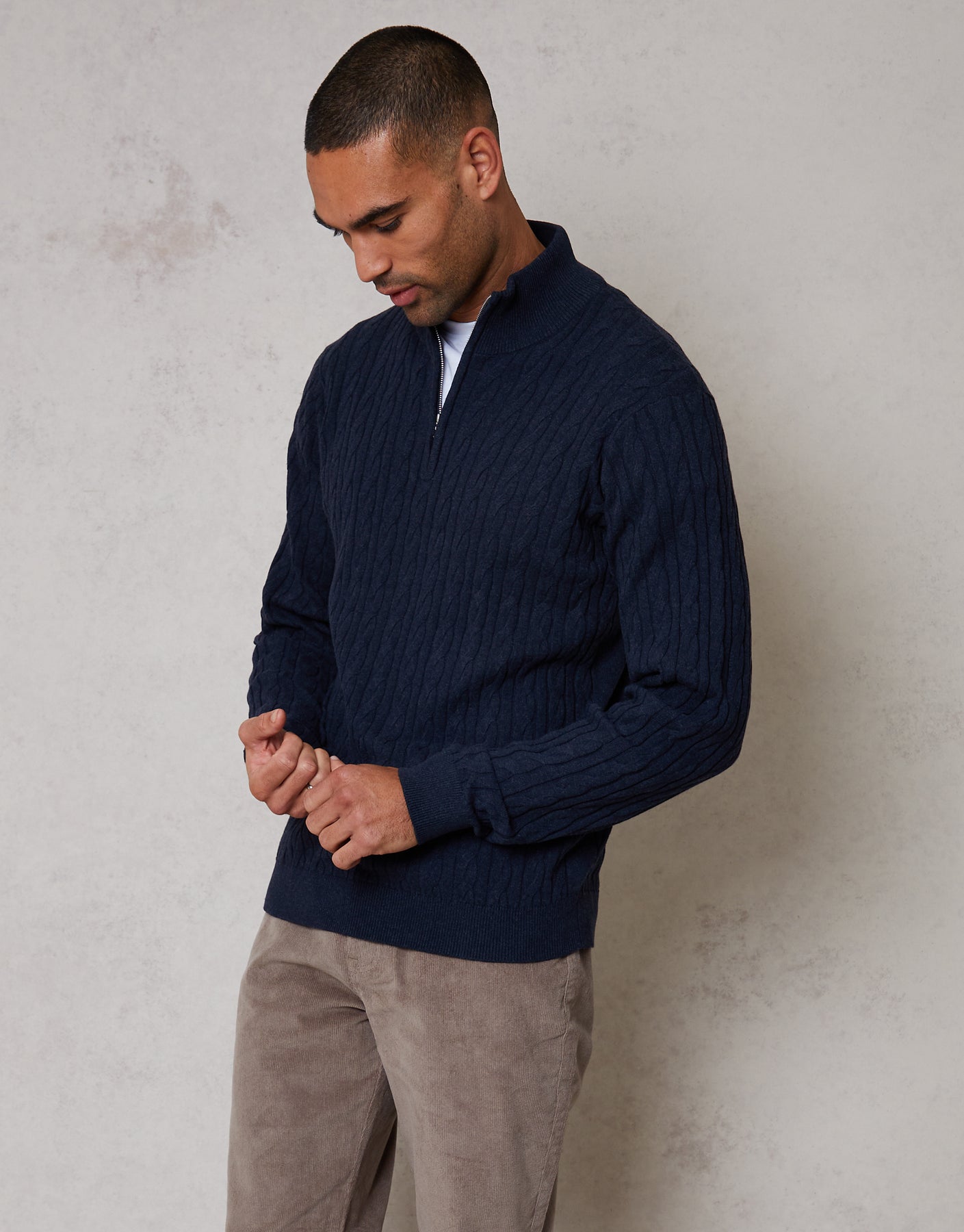 Add a smart layer to any outfit with this Threadbare quarter zip jumper in a cable knit.