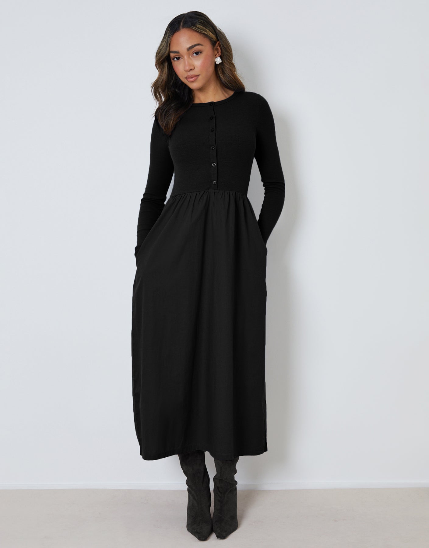 Black 2-in-1 Jersey Poplin Mix Button Down Dress