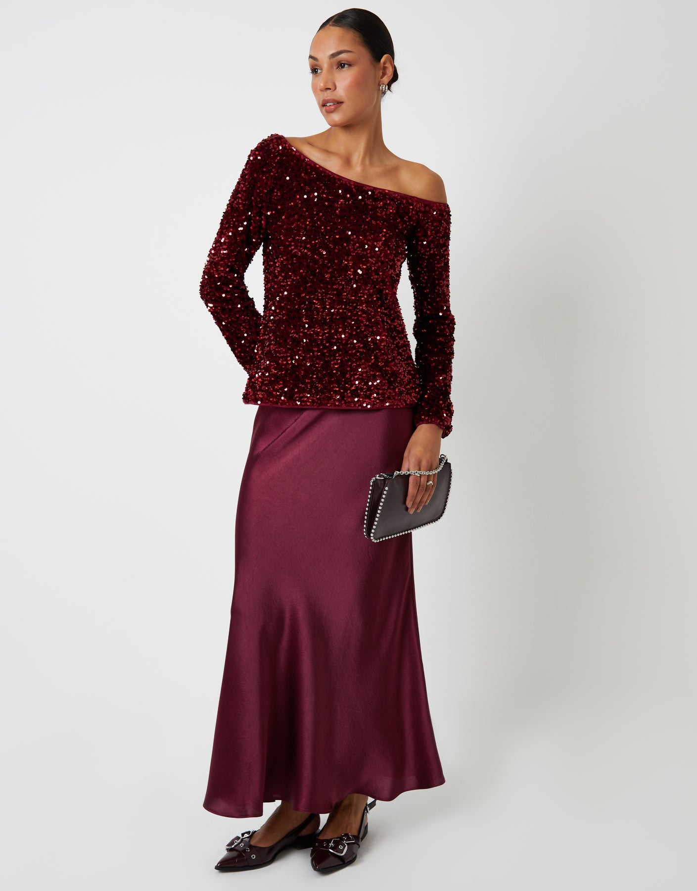 Berry Red Sequin Velour Long Sleeve Slash Neck Top