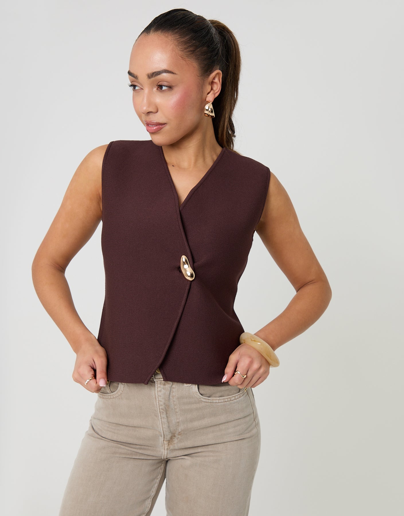Chocolate Brown V-Neck Knitted Wrap Waistcoat