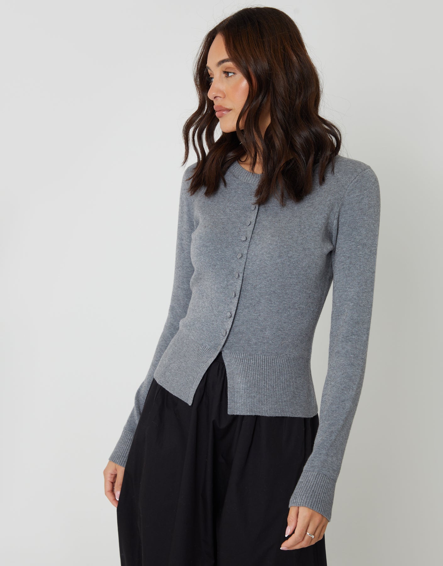 Grey Crew Neck Compact Knitted Cardigan