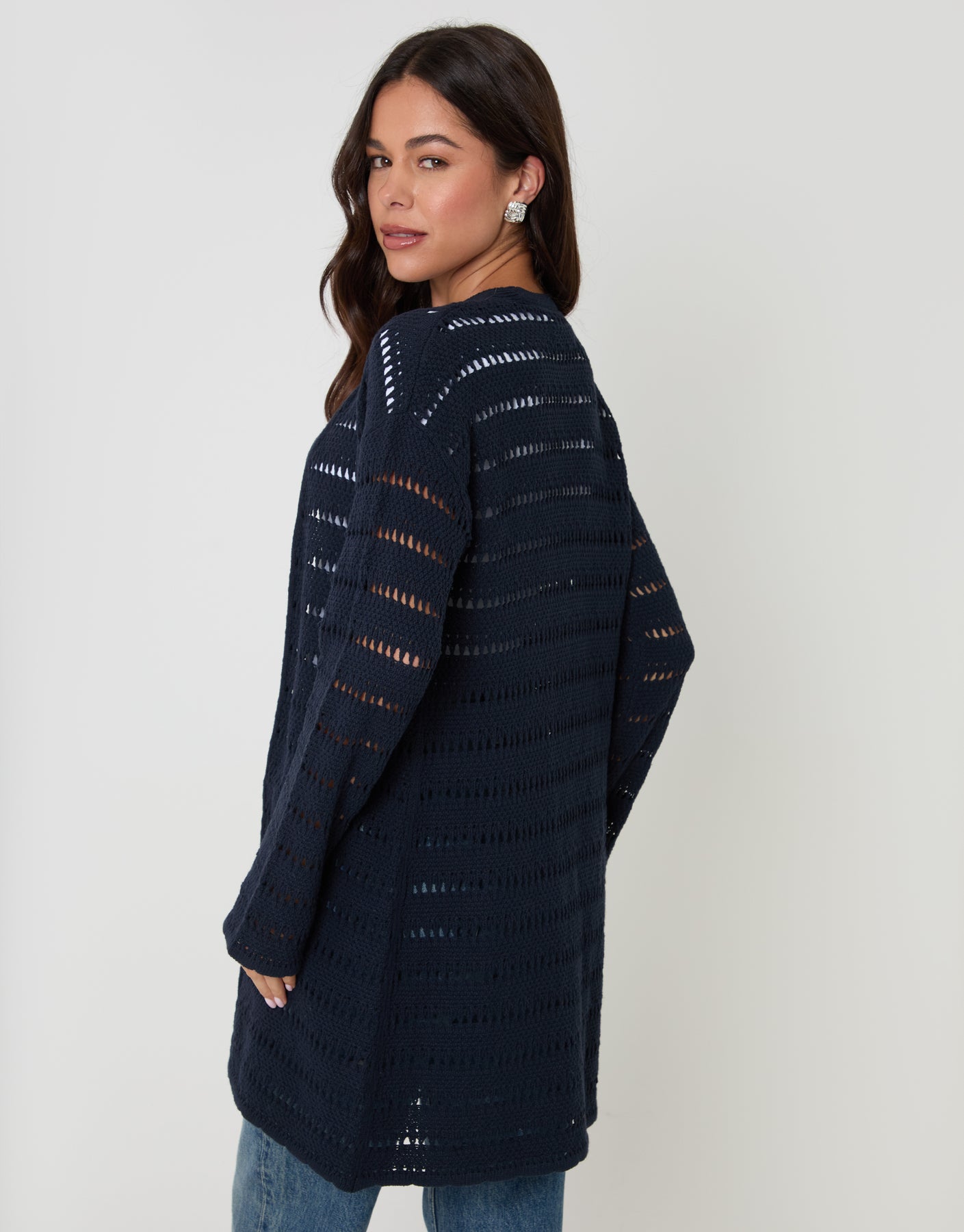 Navy Pointelle Knit Longline Cardigan