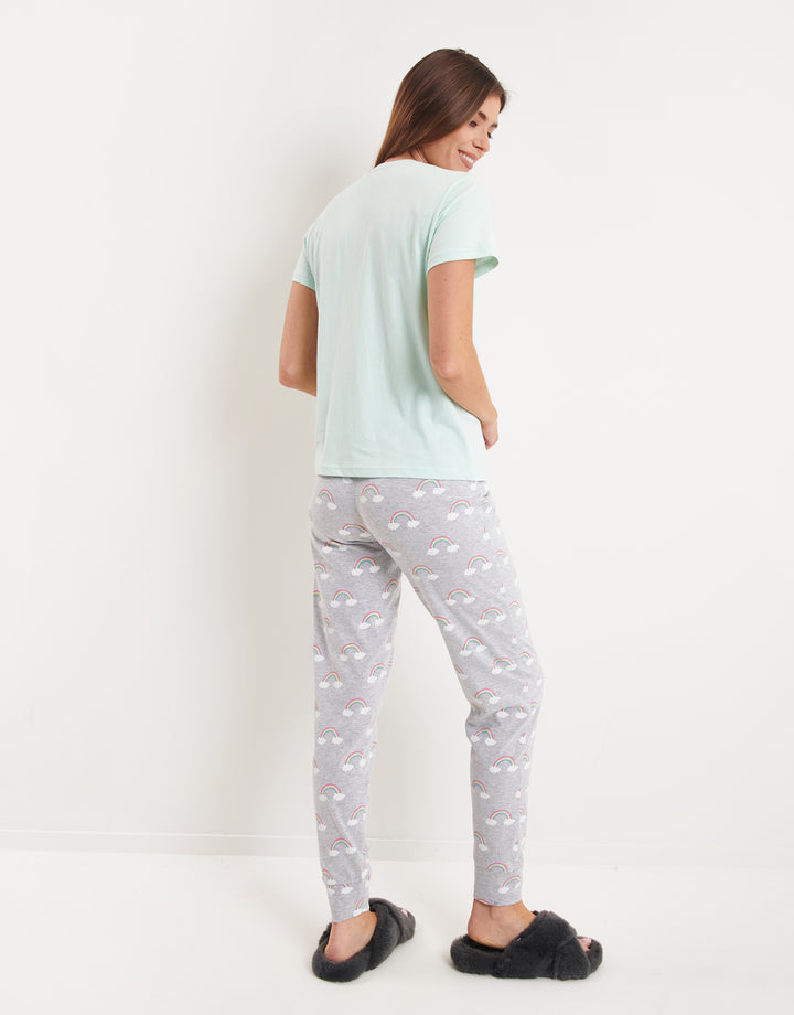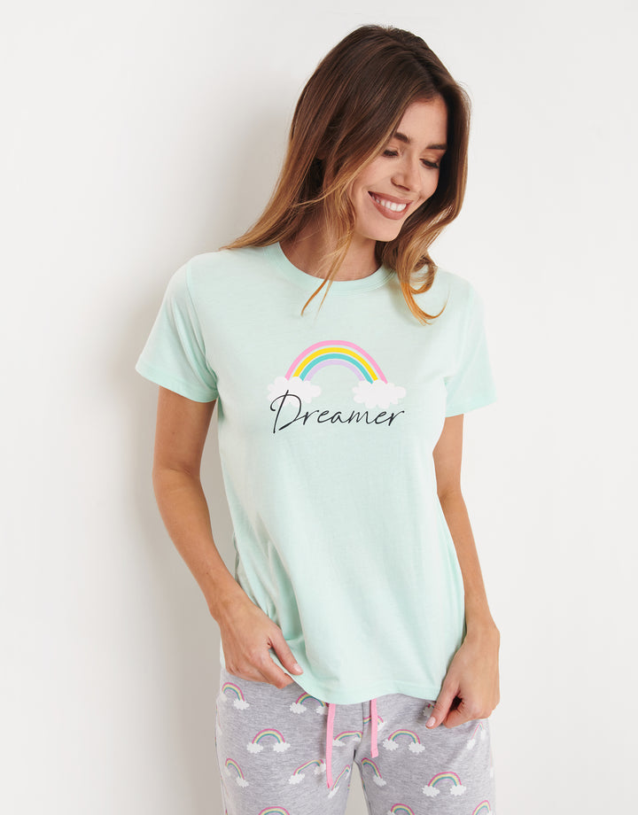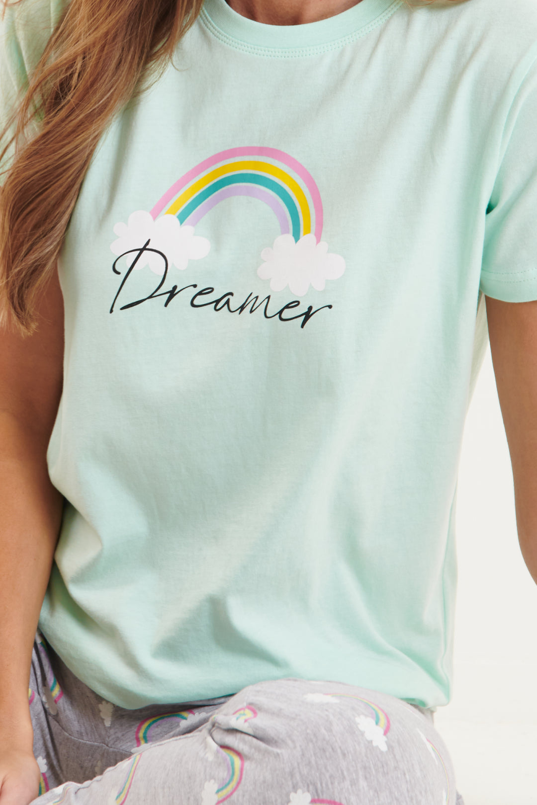 Cut in a regular fit, these pyjamas feature a short sleeve blue t-shirt with 'Dreamer' text and rainbow graphic, and long grey marl pants in all-over rainbow print with an elasticated waistband and pink drawcords.