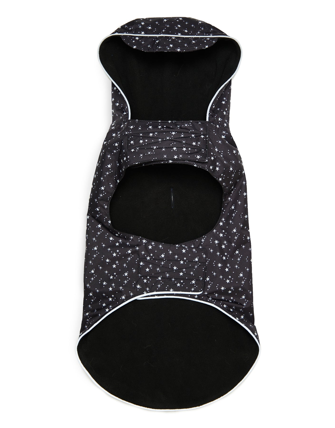 This black and white star print jacket has a hood, hole for their lead and fastens under the belly with a sticky hook and loop strip.
