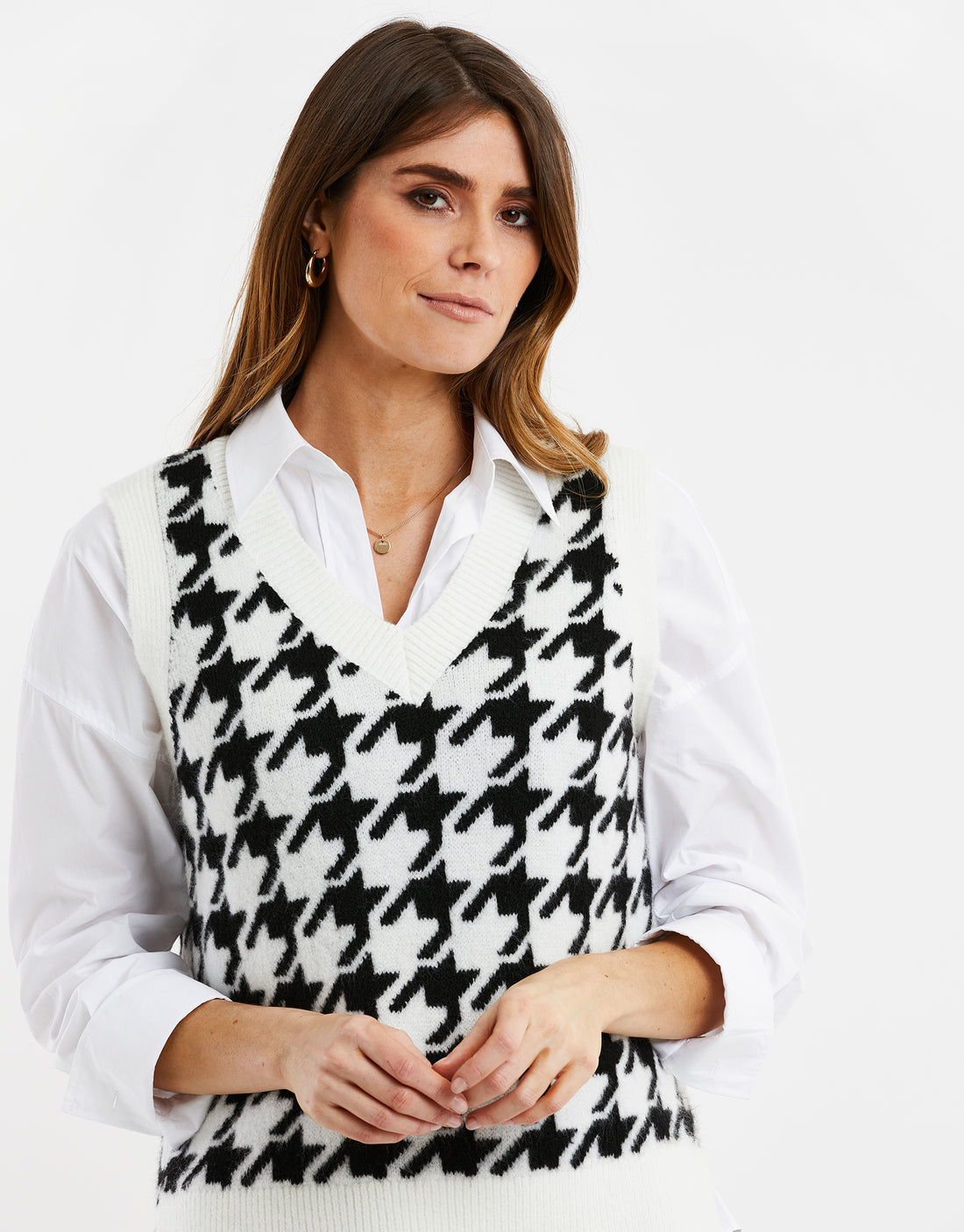 An on trend piece for every season, the knitted vest makes a comeback in a Parisian feel dogtooth print.