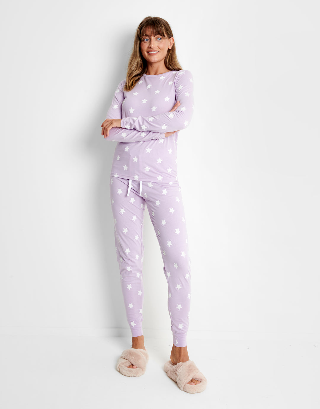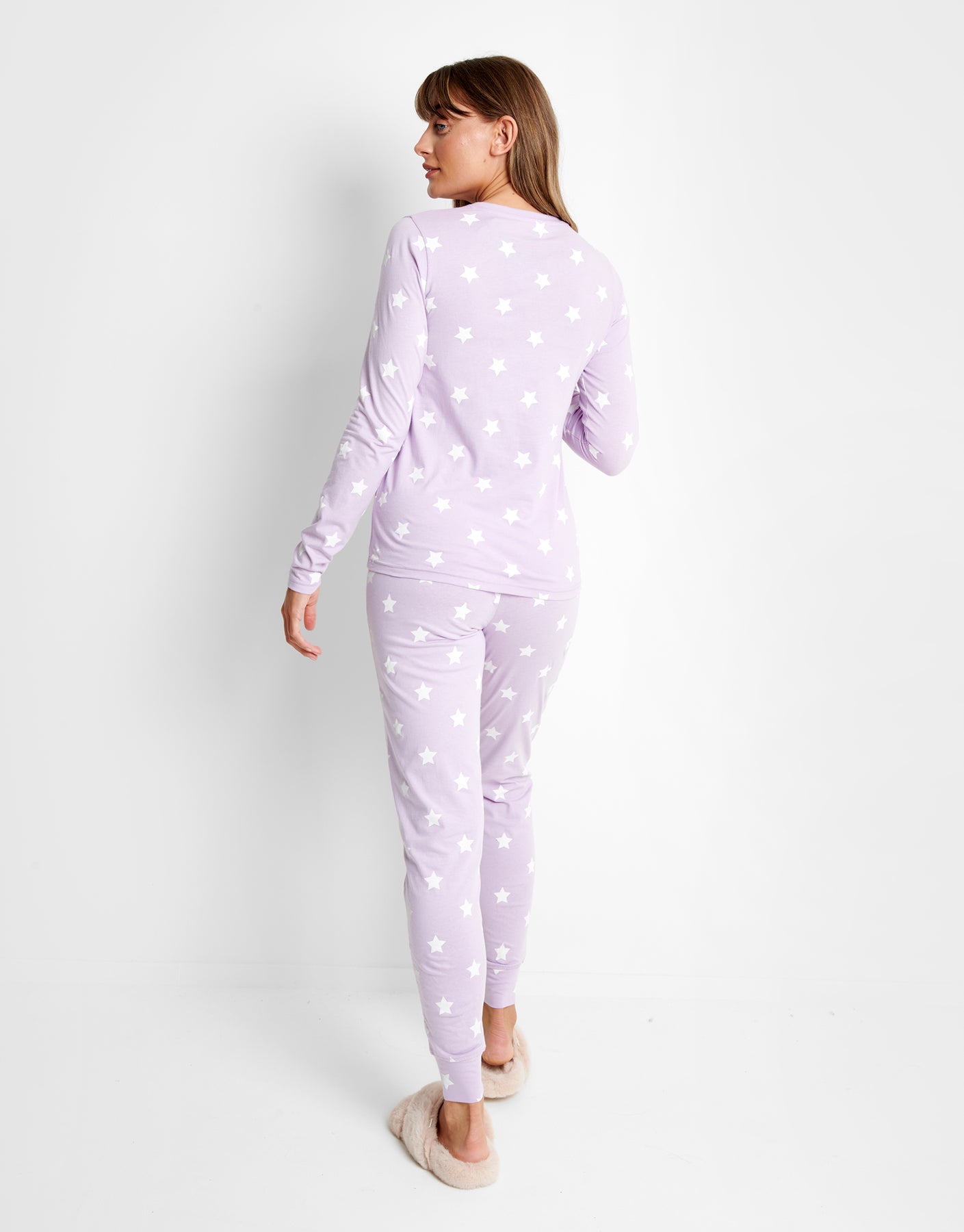 Feel cute while you relax in this loungewear set. Features long sleeve top with star print and pyjama pant with matching print, elasticated waist and drawcord. Alternative colour and matching dressing gown available.
