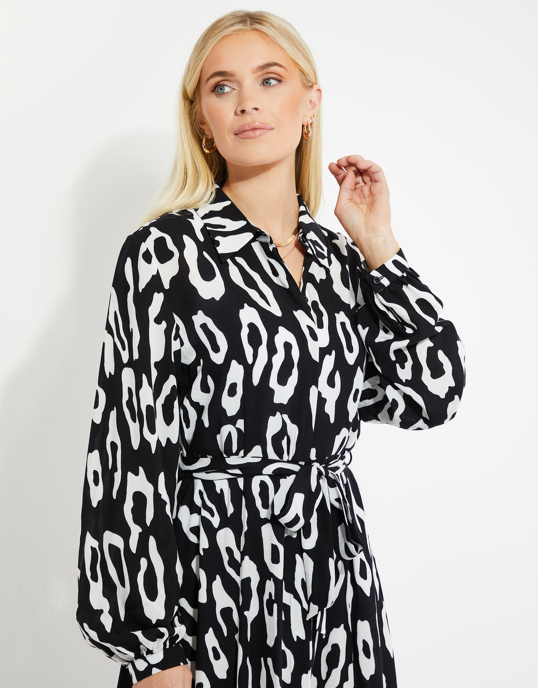 With a collar, button fastening down the chest, self-tie waist belt and long balloon sleeves with cuff, this dress will take you right through the year.