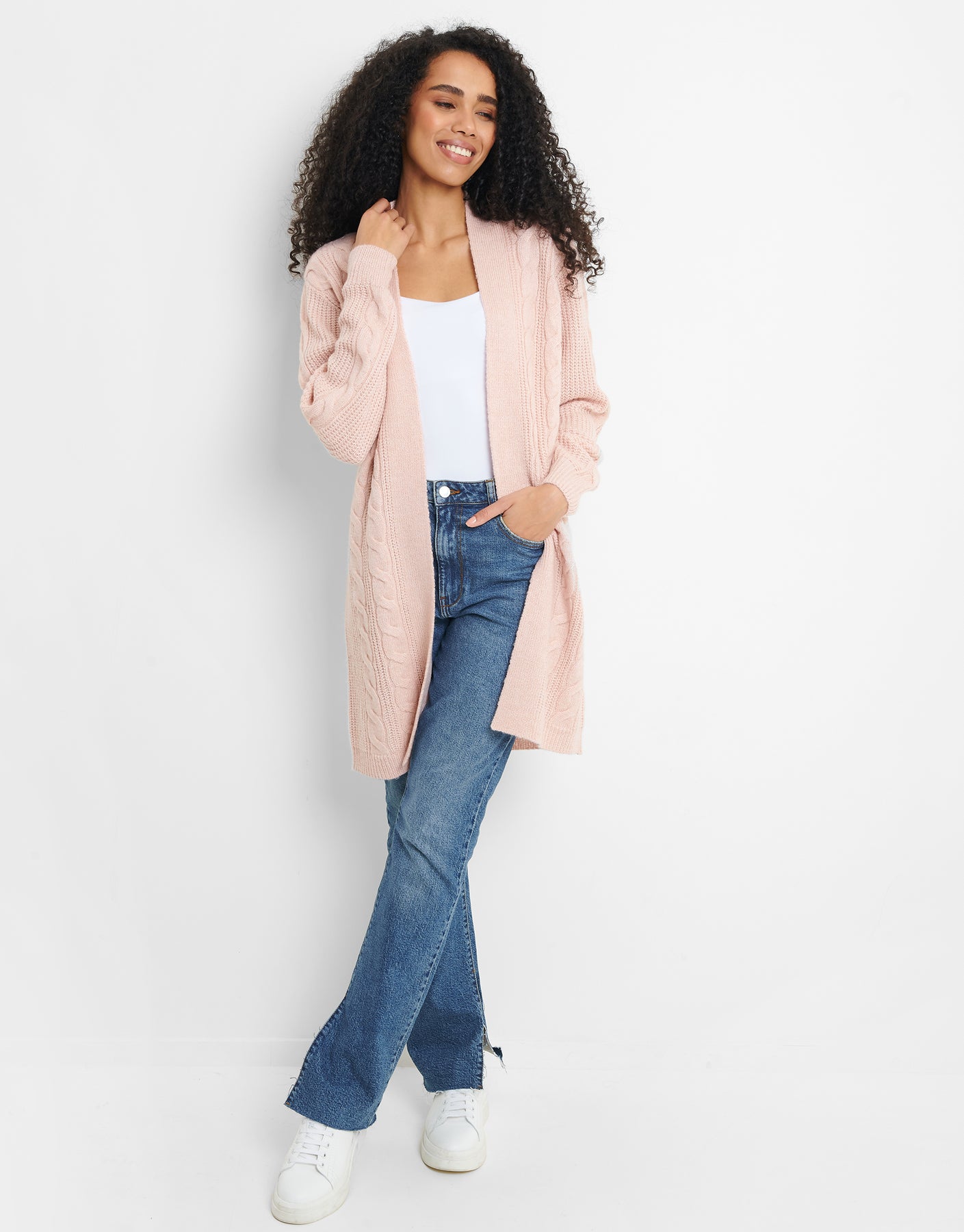 With cable knit detail down the front and on the arms, this knitted cardigan in light pink is a staple knit to add to your wardrobe.