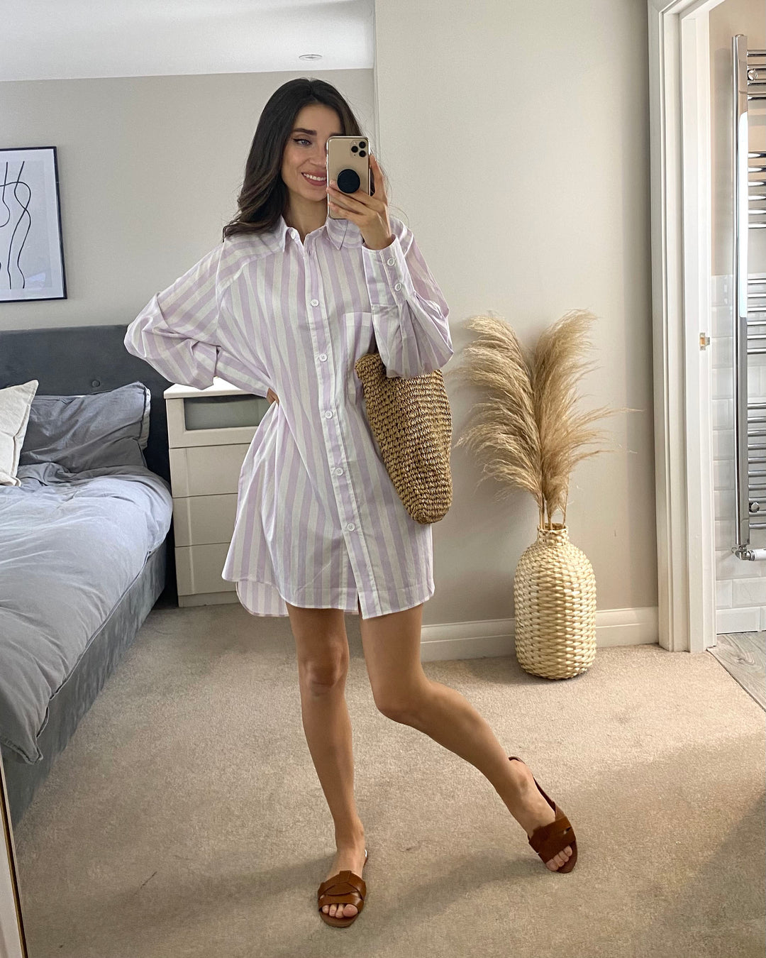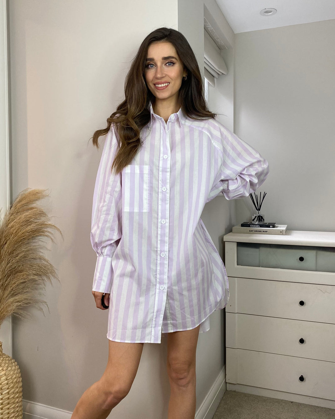 Elevate your wardrobe with this oversized button-down shirt dress with chest pocket detail. Features balloon sleeves, dipped and curved hem, and collard neckline. Perfect for work as well as weekends. Other colours available.