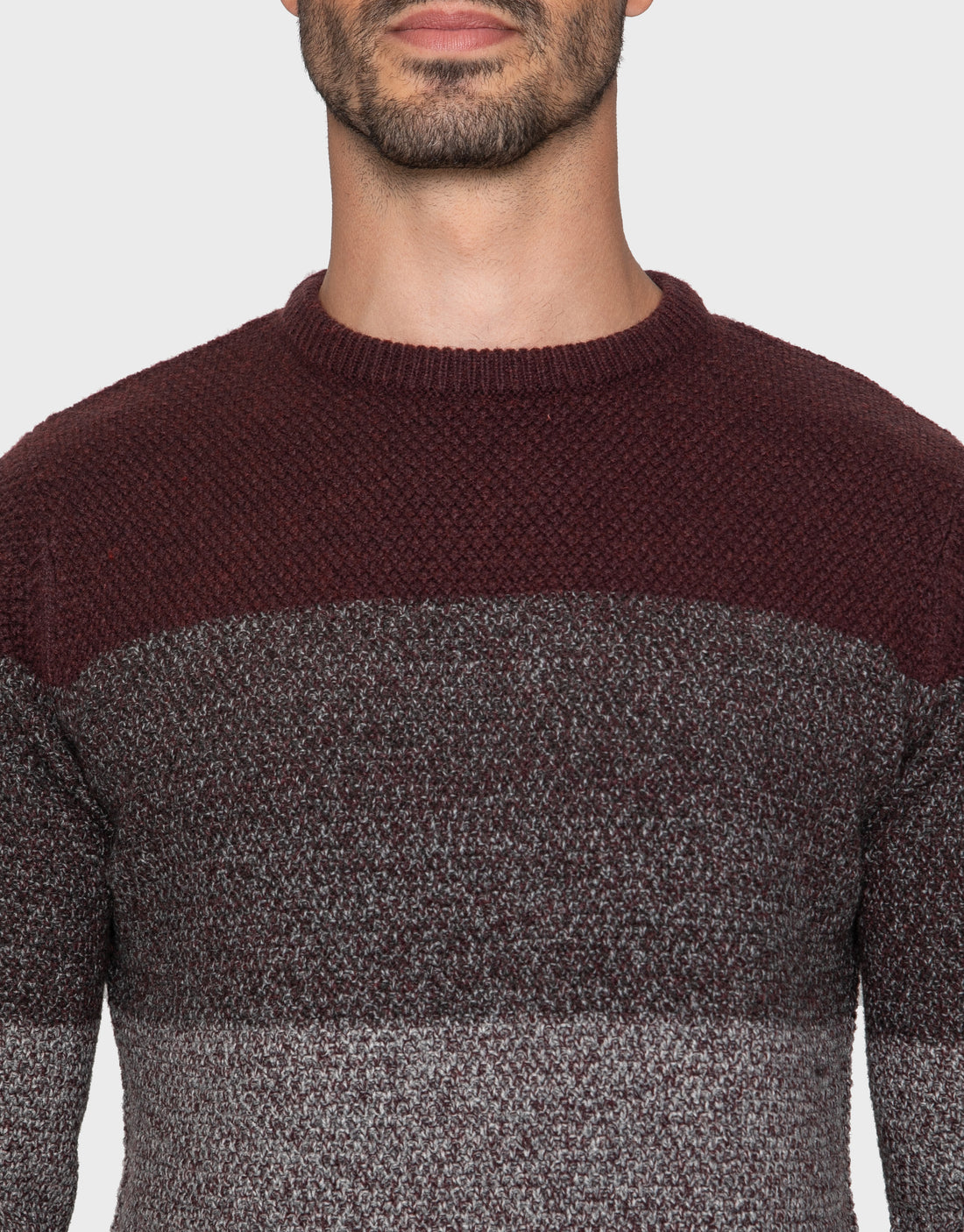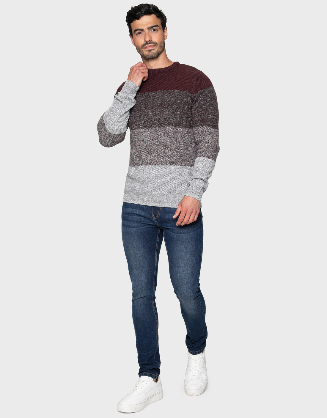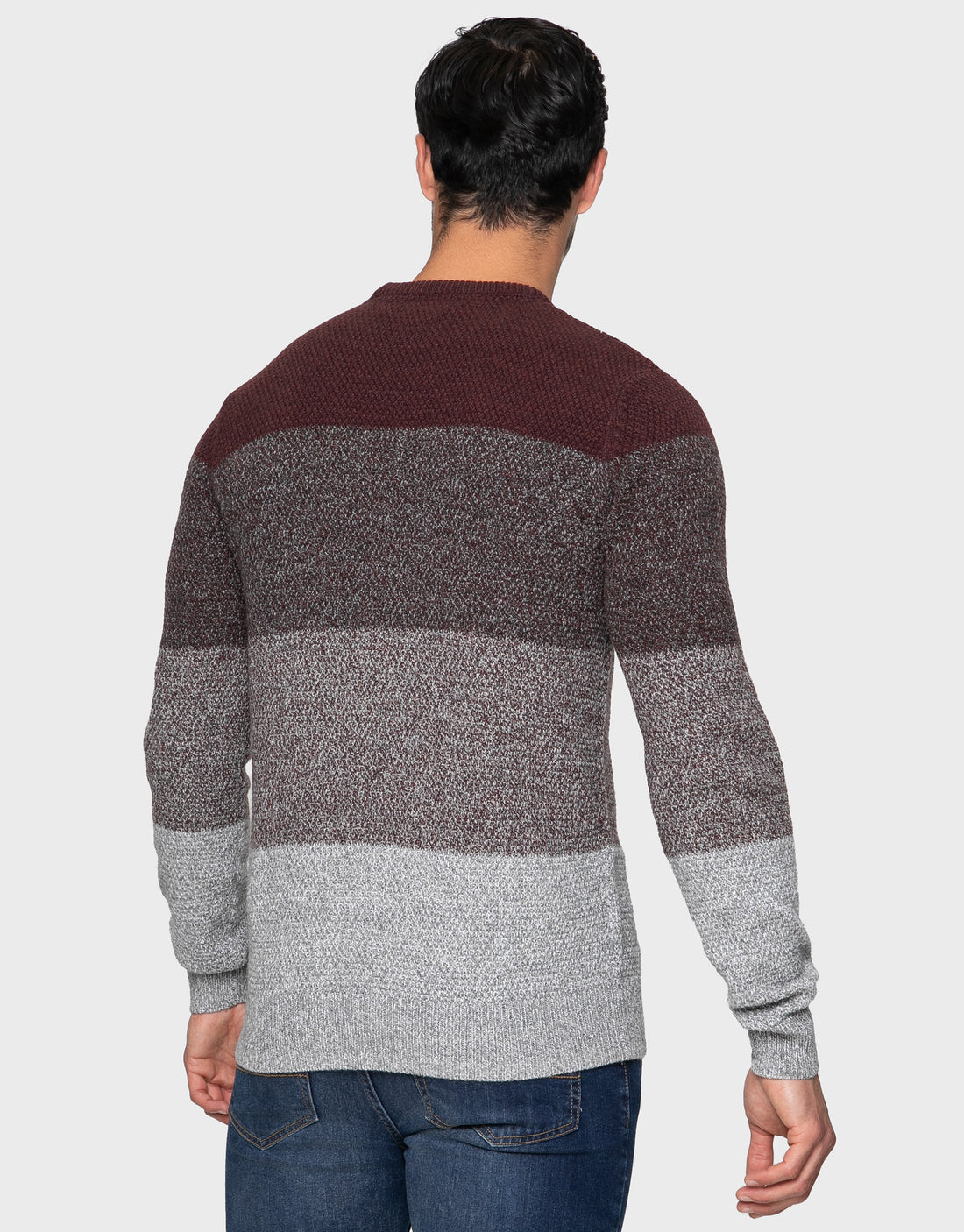 With a crew neck and cut in a regular fit, our jumper has ribbed neck, cuffs and hem, and a colourblock stripe in an ombré effect with a textured stitch front. Finished with our signature woven Threadbare tab to hem.