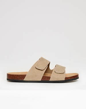 Designed with two faux suede, they feature hook-and-loop fastening for a custom fit. A cushioned cork insole provides soft support, while the lightweight foam outer sole ensures flexibility and grip.