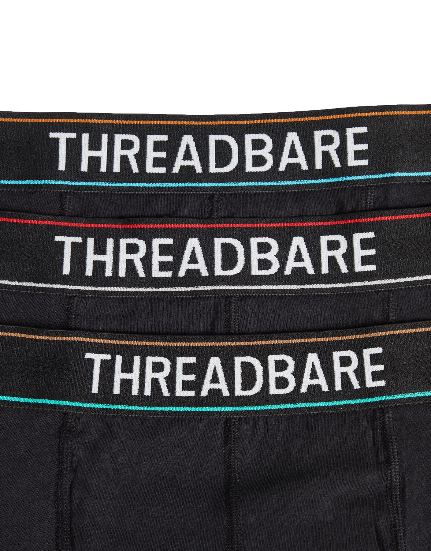 This pack contains three pairs of black hipster shorts, each with a different colour detail to the waistband.