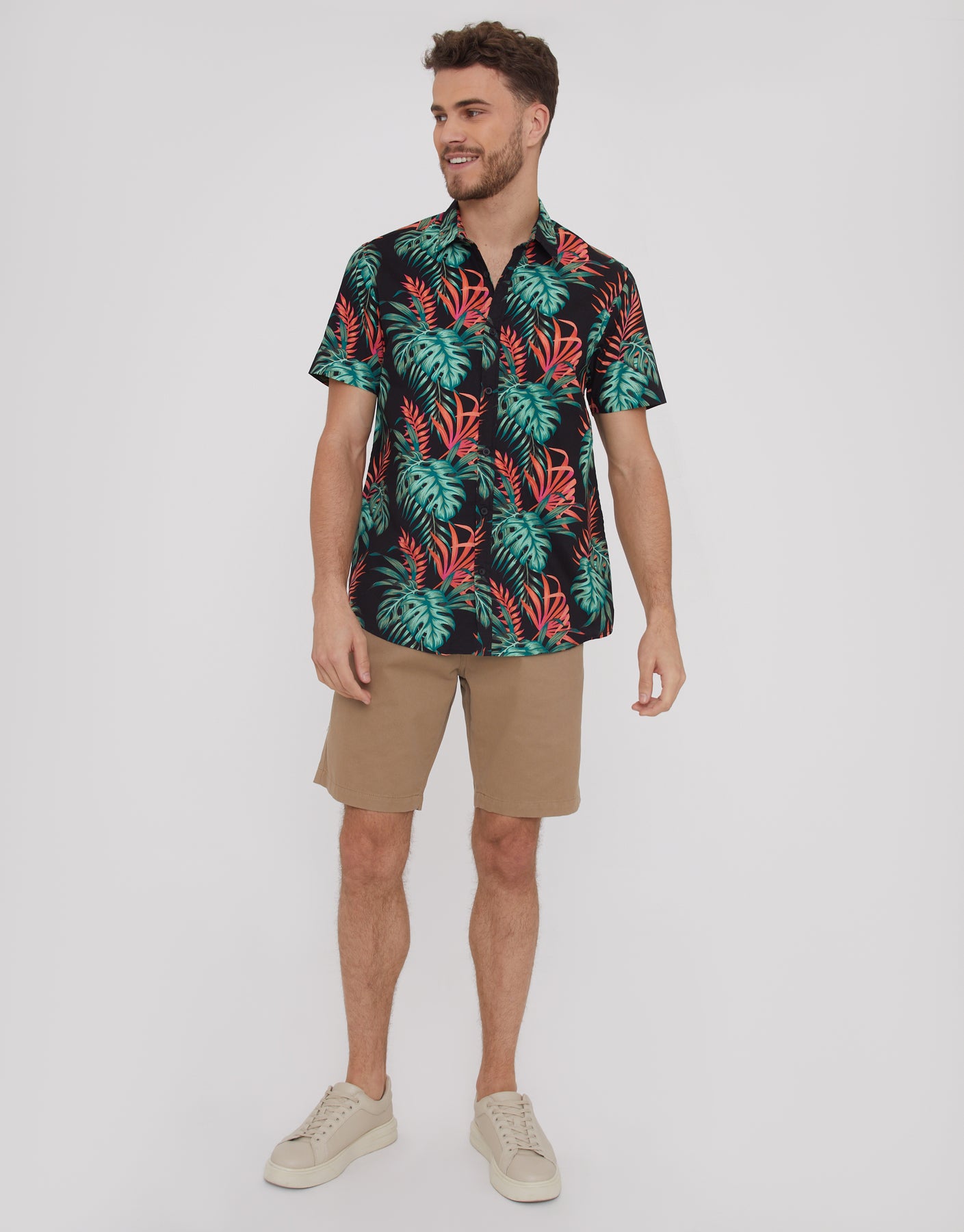 Add some pattern to your wardrobe this season with this Threadbare tropical shirt featuring a classic short-sleeve design and an all-over tropical leaf print.