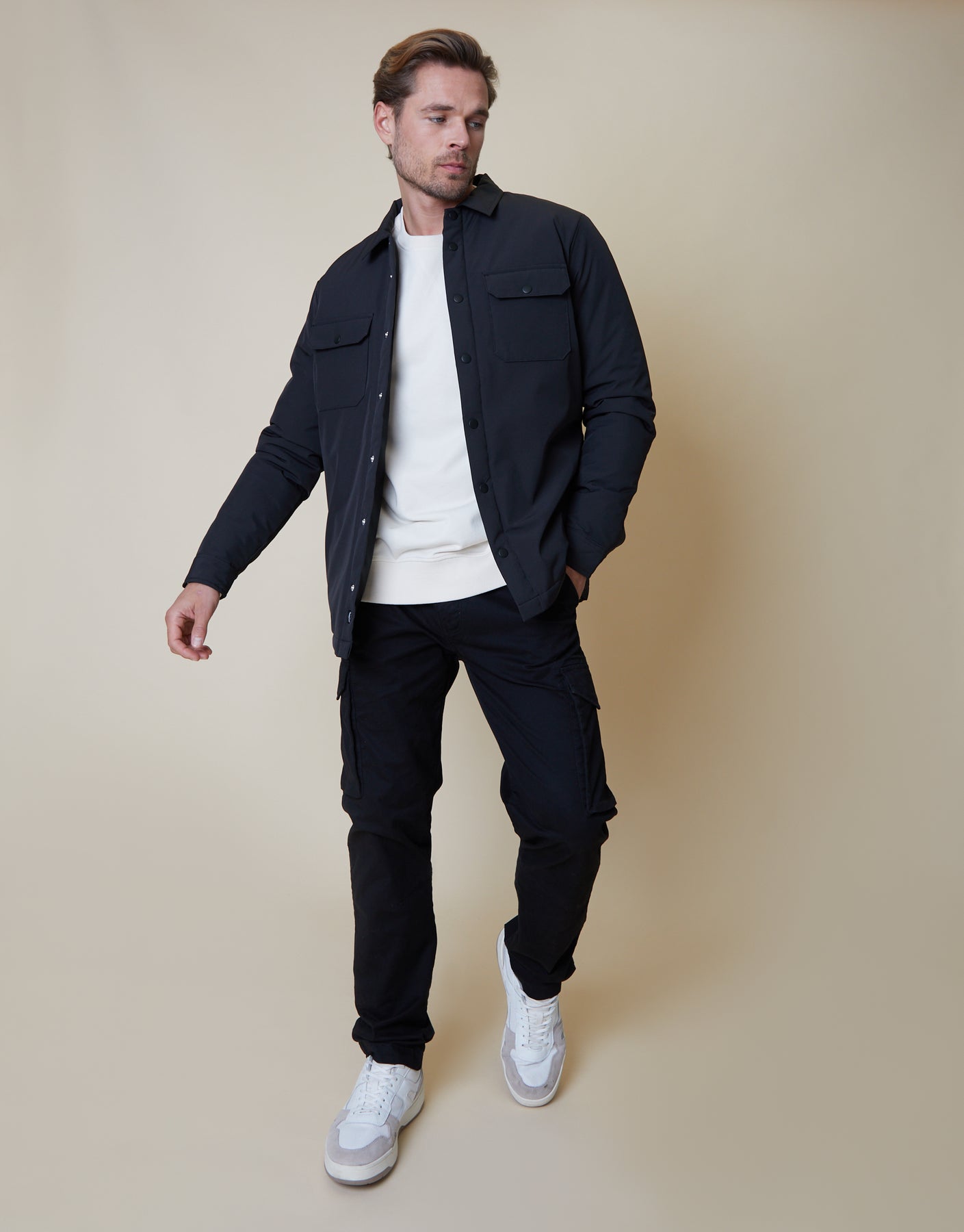 Ideal for transitional dressing and in-between weather, this lightweight shacket has padding throughout, a collar and snap-fastening cuffs for easy wear.