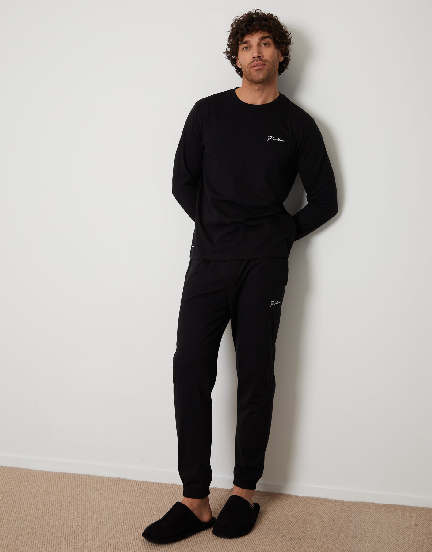 Whether you sleep in them or lounge about, this two-piece set features a long sleeve black t-shirt and a round neck and is finished with Threadbare script embroidered on the chest.