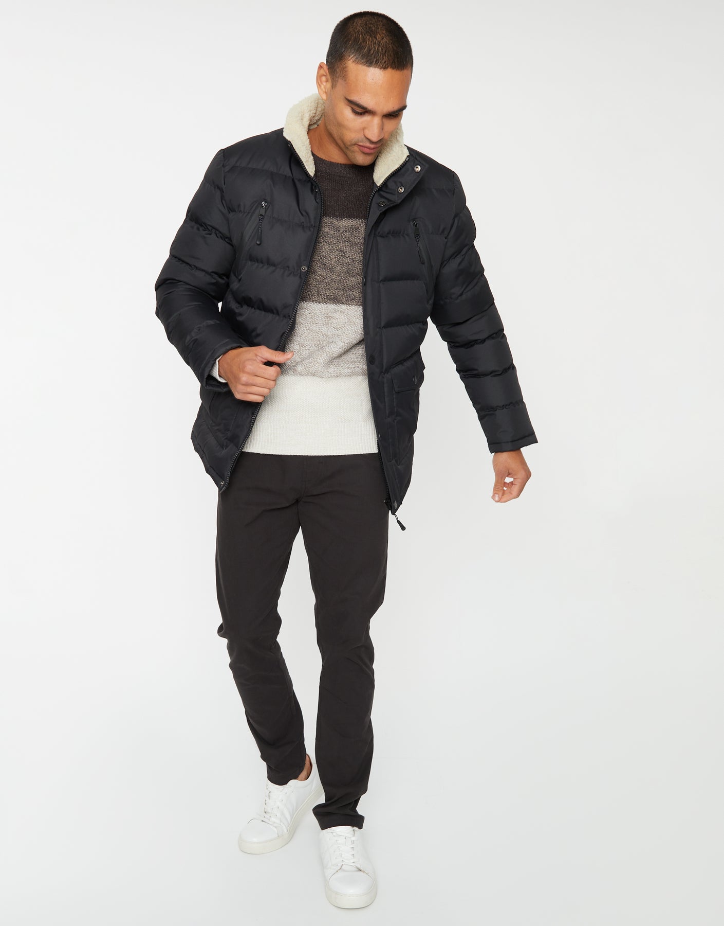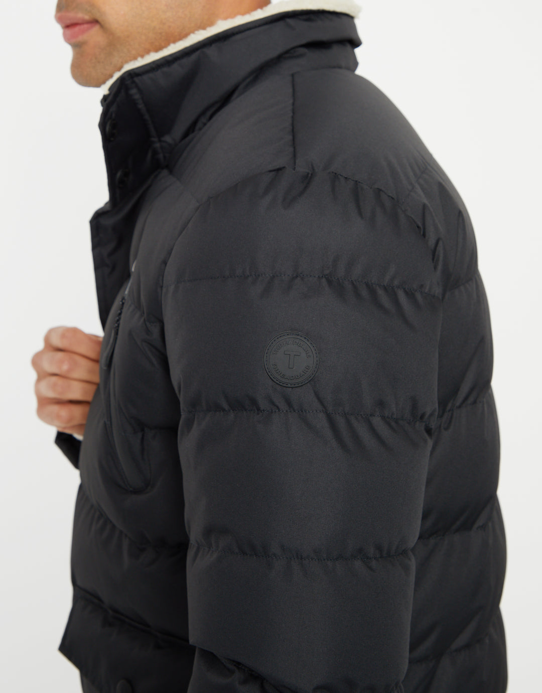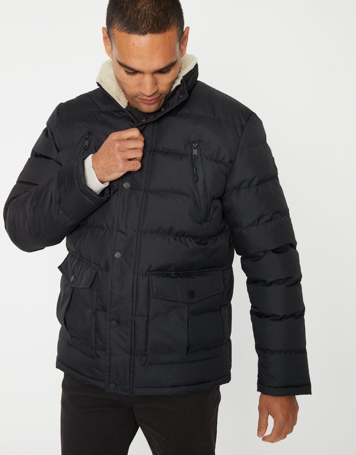 Black Showerproof Utility Puffer Jacket with Sherpa Lined Collar