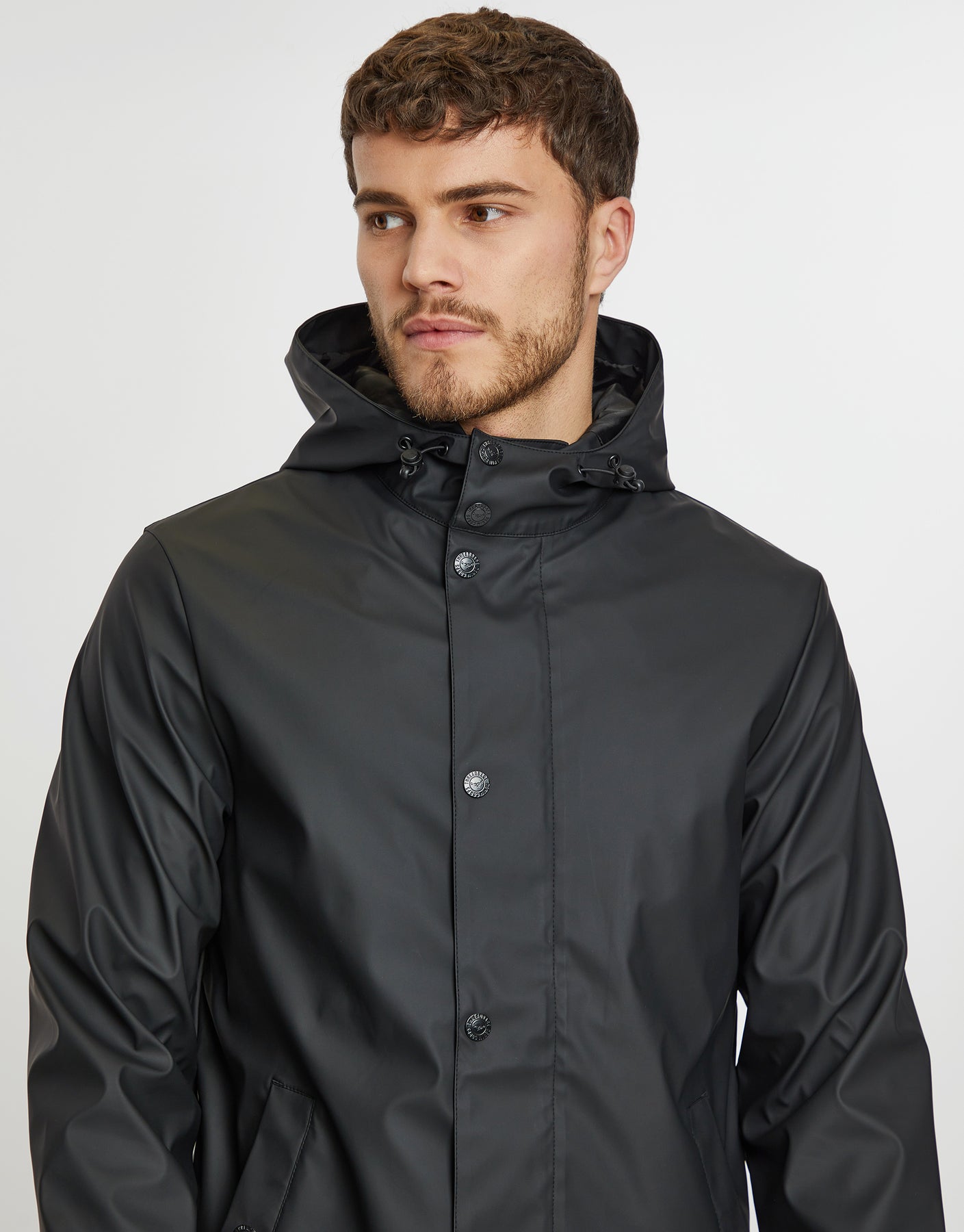 With hood and simple slimline look, this mac style coat has a concealed zip fastening with snap fasteners to the placket and two pockets to rest your hands.