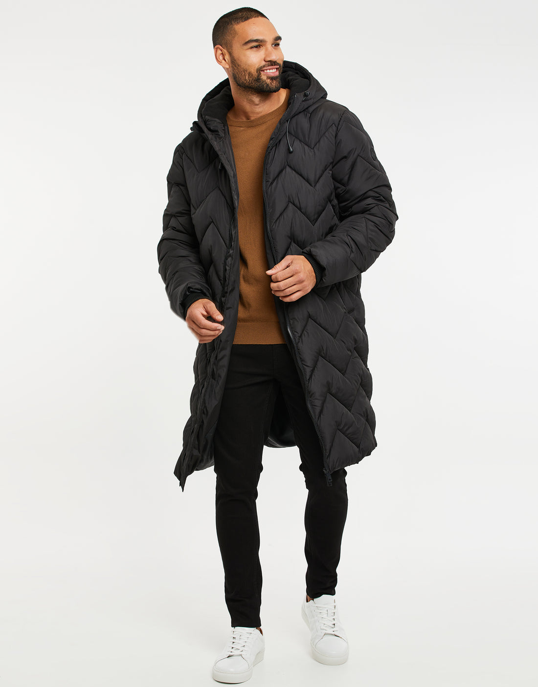 With zig zag padding, this duvet hem puffer coat has a full zip fastening, microfleece-lined hood with bungee cords, and two angled pockets. Finished with Threadbare badge on the left arm for signature brand recognition.