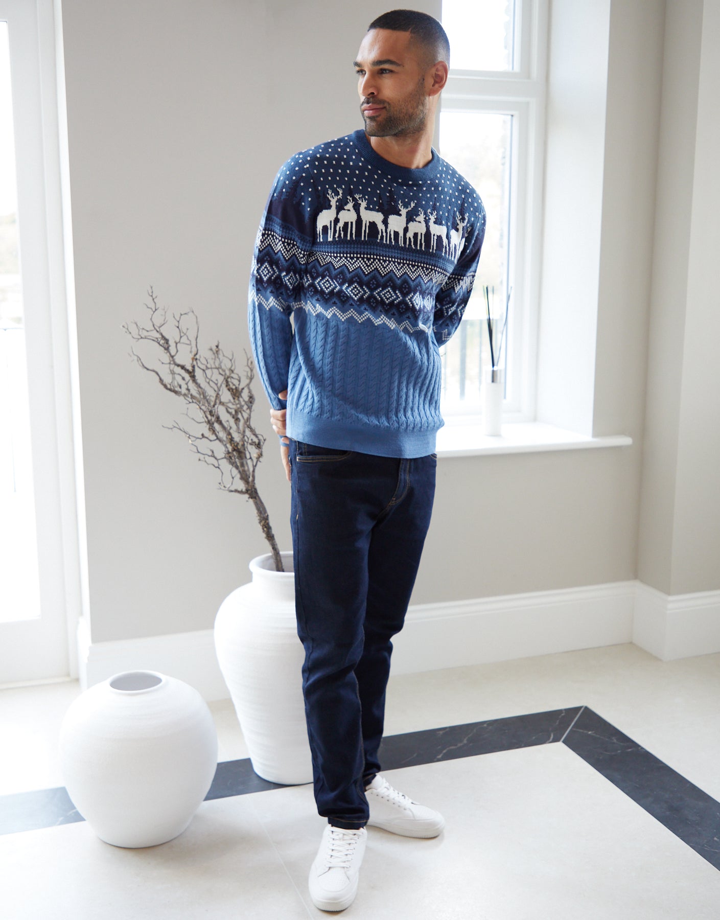 - Festive reindeer fairisle jacquard knit pattern across chest, back and arms