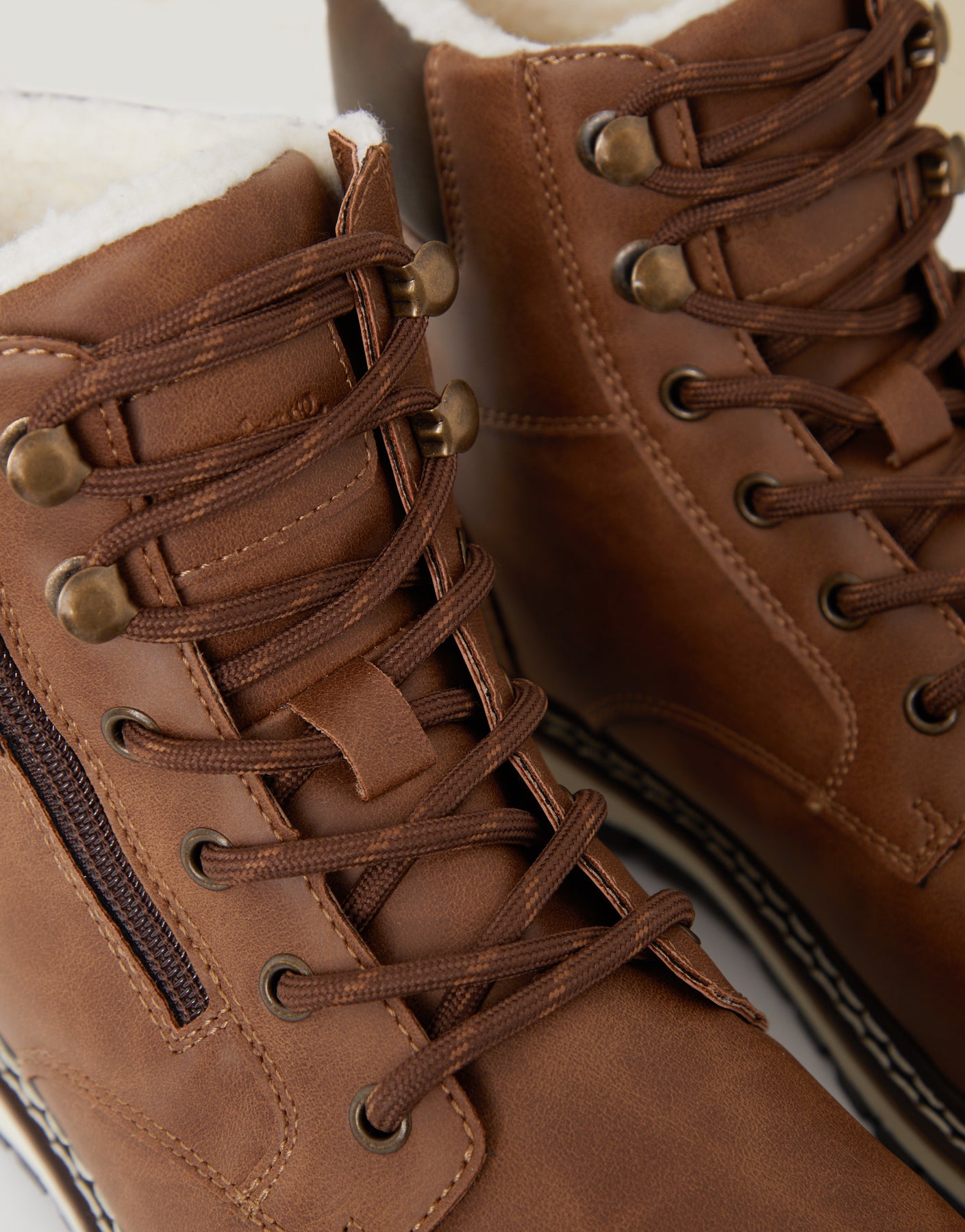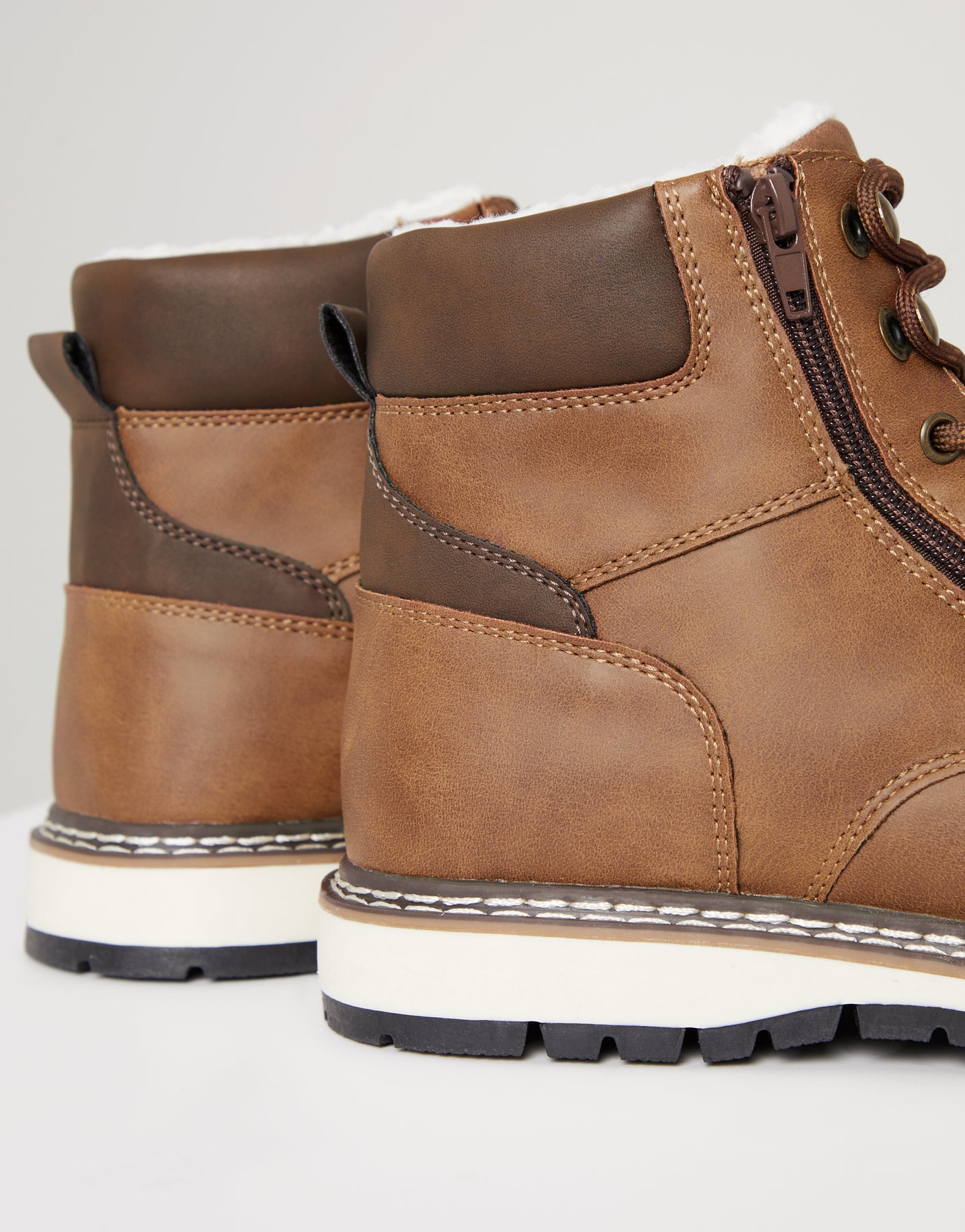 Crafted with a cosy sherpa lining for maximum warmth and comfort, these premium feel boots made from faux leather lace up with two-tone laces and also fasten with a functional zip to the side for ease of taking off and on.