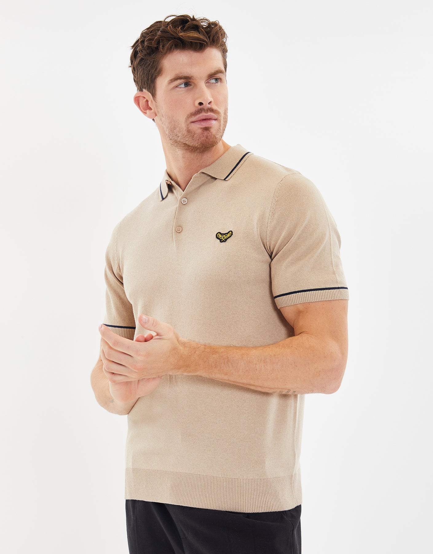 Camel Brown Tipping Button Collar Knitted Polo