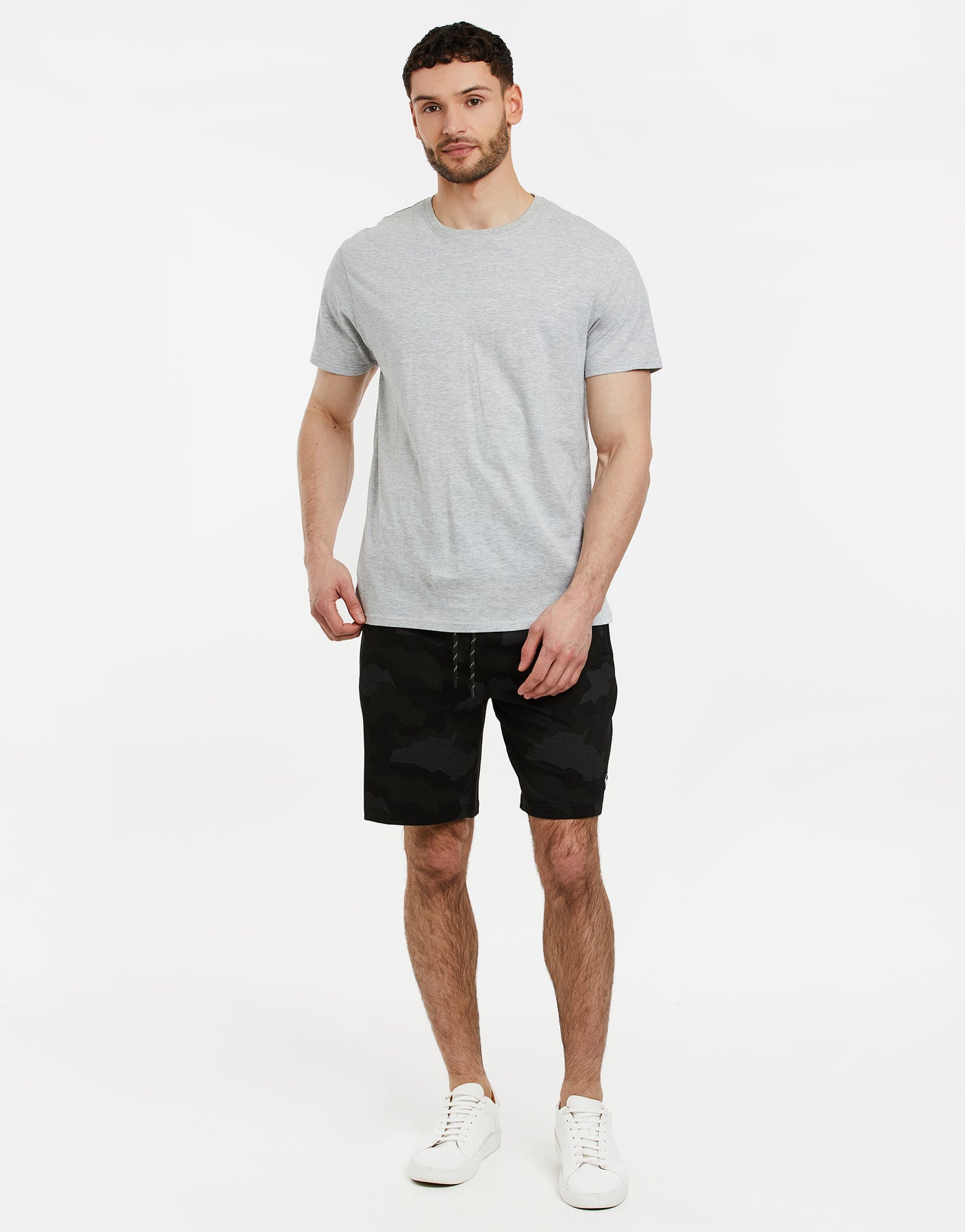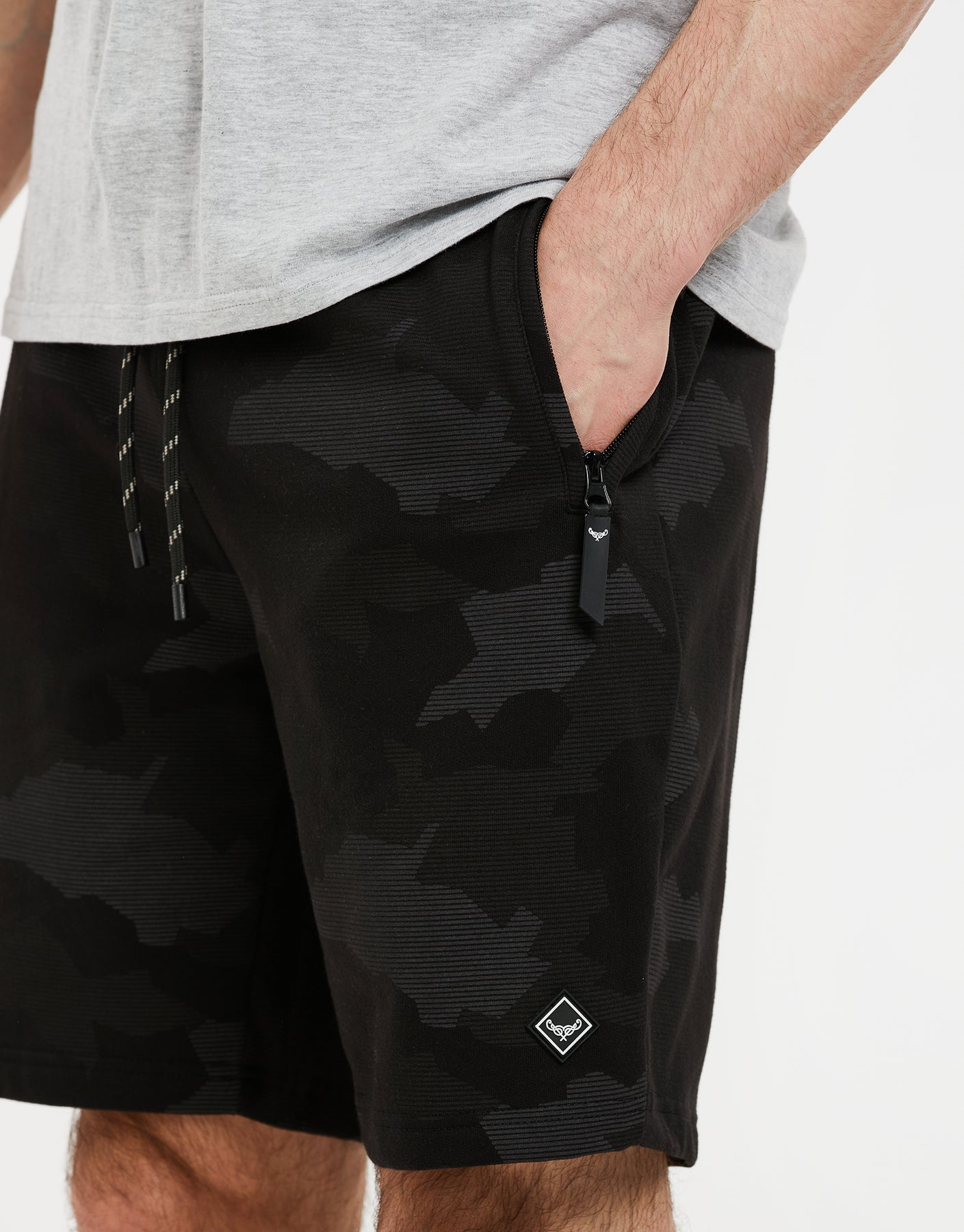 These camo print fleece shorts from Threadbare have an elasticated waistband with a branded drawstring and side zip pockets.