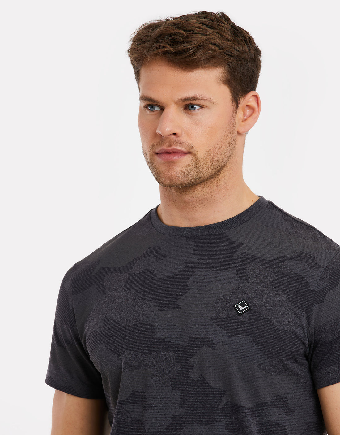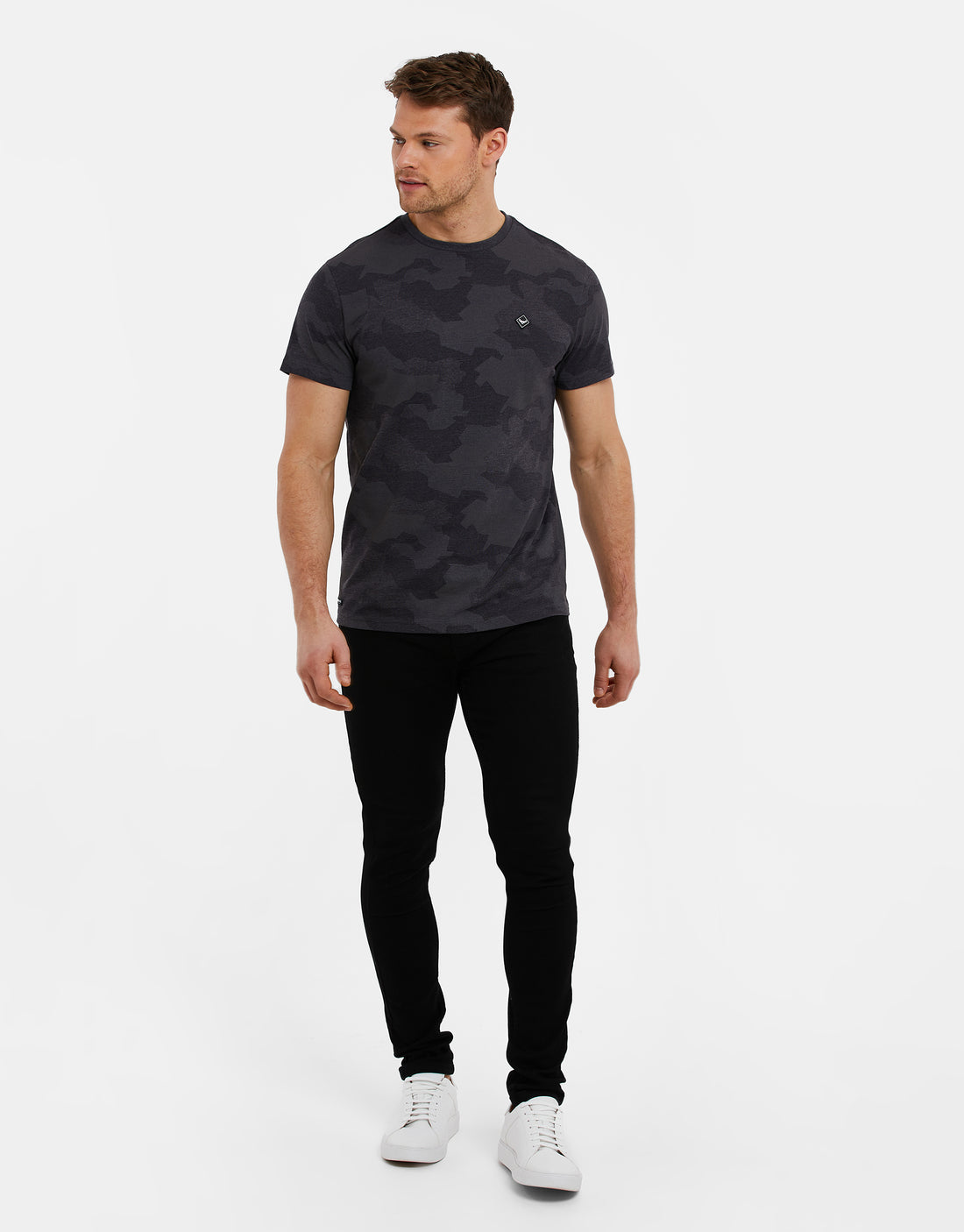 A plain tee with a twist, this Threadbare charcoal grey t-shirt is designed with an all over camo print and raised rubber logo.