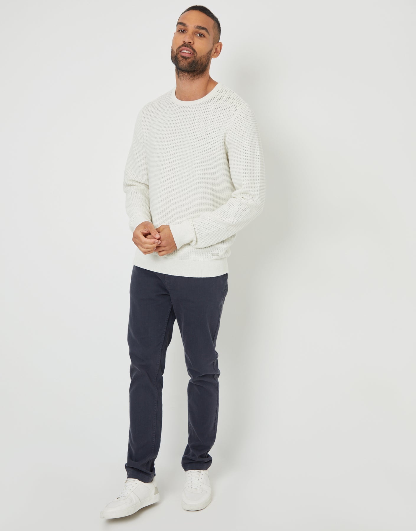 In a textured crochet knit, this crew neck jumper made from recycled yarns is designed for everyday wear. Ribbed cuffs and hem will keep you snug, and the regular fit will suit all body types. Finished with our signature Threadbare metal hem badge for coveted brand recognition.