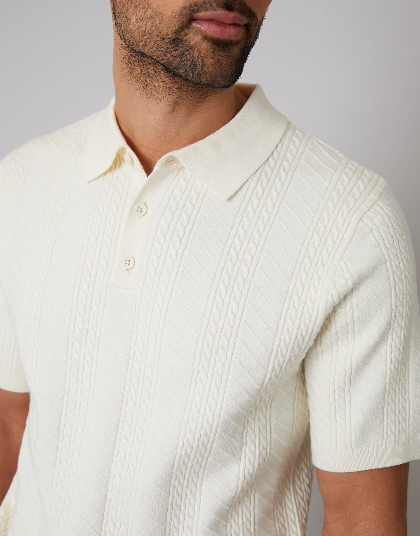 With a Milano stitch collar with branded buttons, this short sleeve knitted polo has small ribbed cuffs to the sleeve and a ribbed hem. In an all-over mini cable knit to make it the perfect transitional piece for in-between weather, and finished with a metal branded tab above the hem.