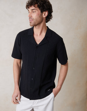 This shirt with textured geometric stitch panels on the front has a ribbed revere collar and short sleeves, giving a laid-back but refined charm, and has tubular cuffs and hem. Complete with full button-down fastening for easy styling.