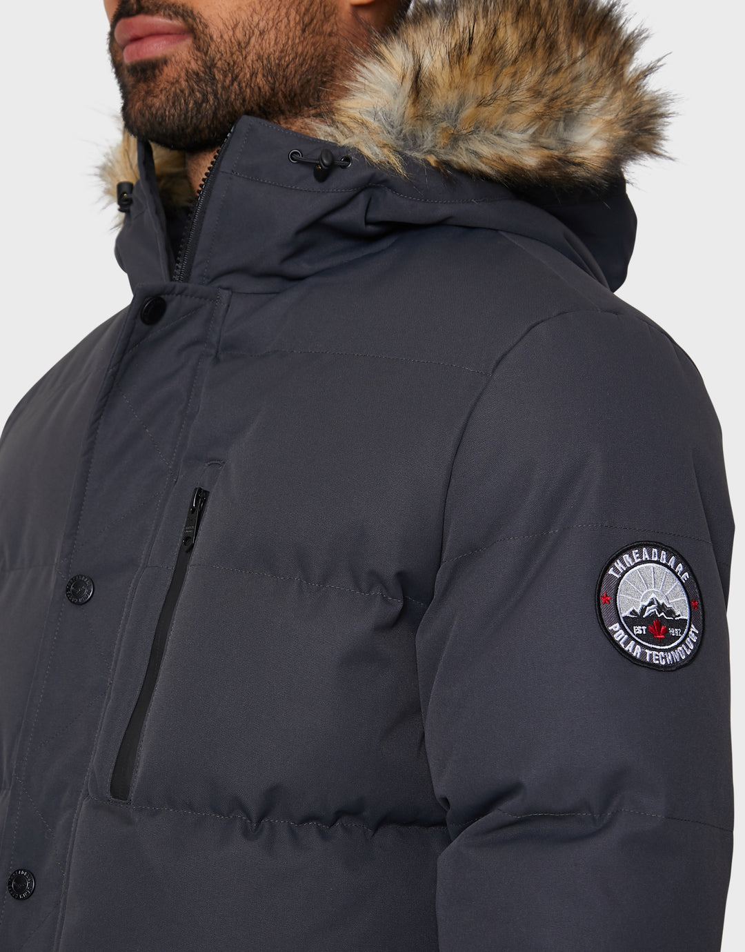 Crafted with you in mind, make use of two side pockets, one chest pocket and an inside velcro pocket to store your belongings safely. The quilted detail nods to the sought-after trend, and fur trimmed hood and Threadbare branding badge on the arm elevate this winter jacket. Full zip and snap fastening give you the option to fasten it how you wish.