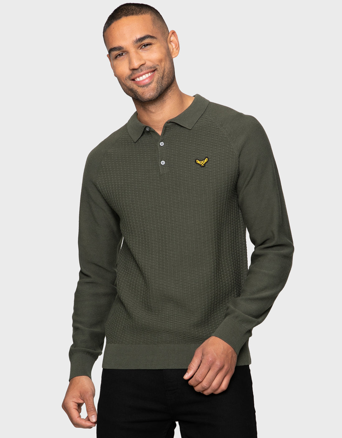With a polo neck style collar that buttons up, this jumper has a textured knit on the front panel, and has ribbed cuffs and hem to keep you snug.