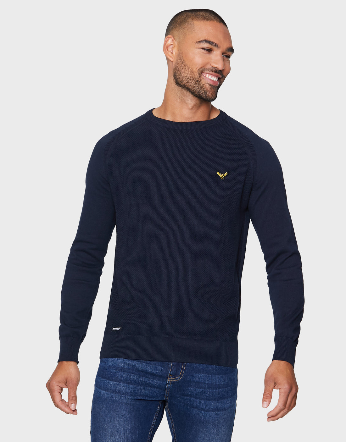 With a ribbed neck, ribbed cuffs and hem, this jumper is a smart staple for your knitwear collection. Cut in a regular fit and with raglan sleeves and a textured front panel, it's an easy piece to style as you wish. Finished with our signature Threadbare embroidery on the chest.