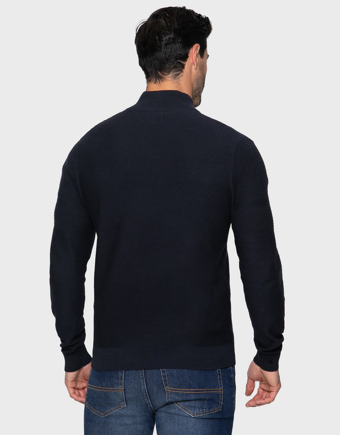 In a fine knit that fits close to the body, this knit cardigan has a subtle cubed knit detail across the chest and a quarter zip making it an easy throw-on piece. Funnel neck, ribbed cuffs and hem will keep you snug. Finished with our Threadbare embroidery on the chest and woven Threadbare label for brand recognition.