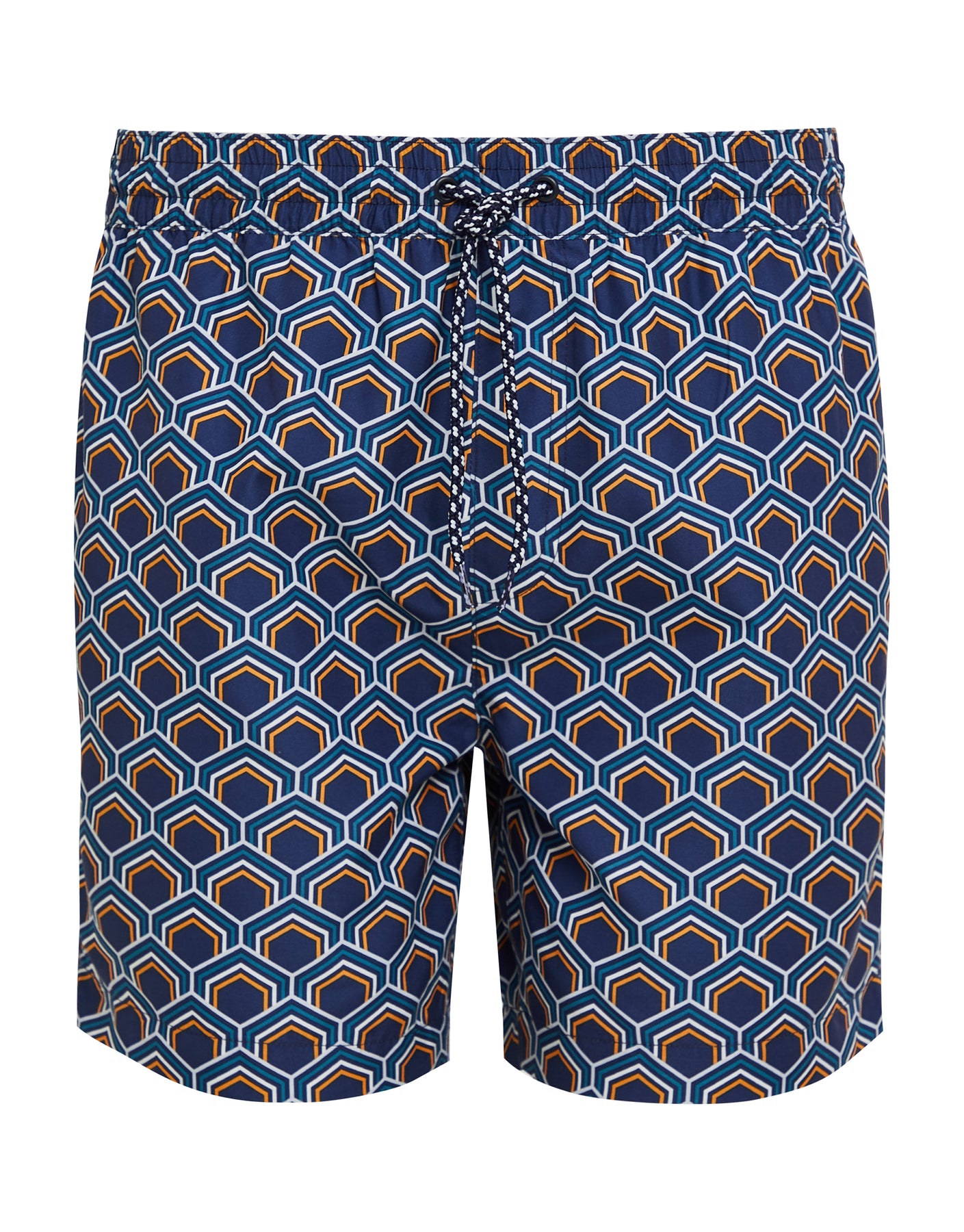 With a sundial gold and blue hexagonal geometric print, these swimshorts are made from 100% recycled polyester and have an inner mesh lining for comfort and support when swimming. They have an elasticated waistband with eyelets and drawcords for that desirable sporty finish, and a welt back pocket with a touch and close fastening for an extra touch.