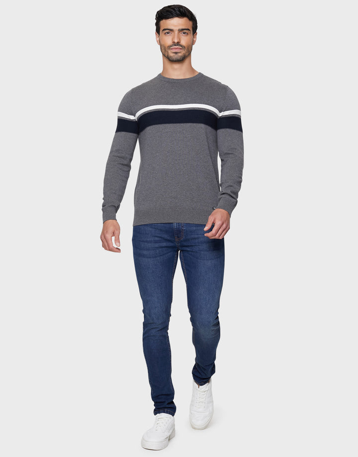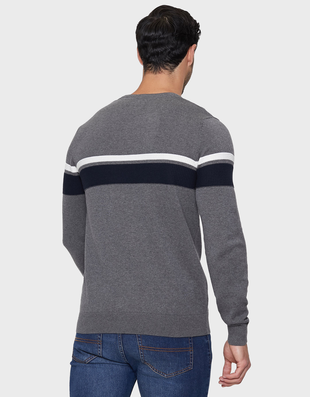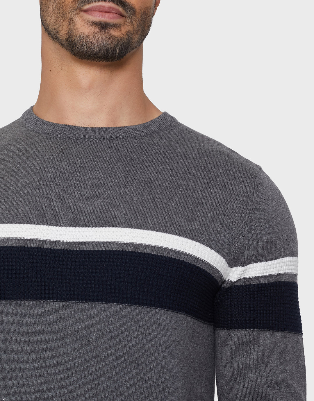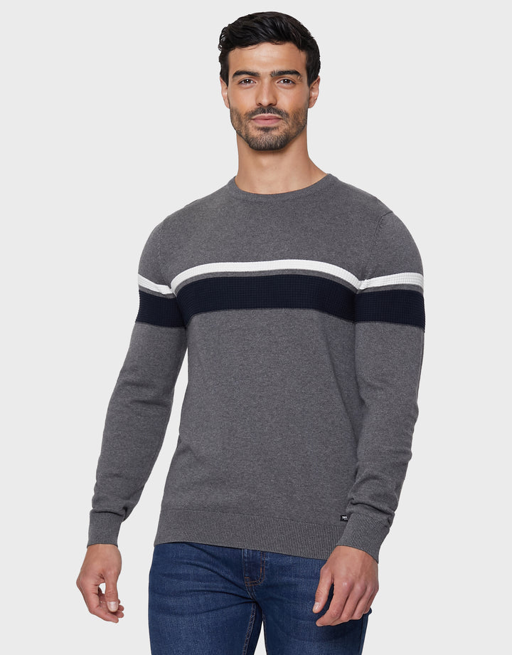 With a crew neck and cut in a regular fit, our jumper has ribbed cuffs and hem, colourblock stripe with textured detail to the chest. Finished with our signature woven Threadbare tab to hem.