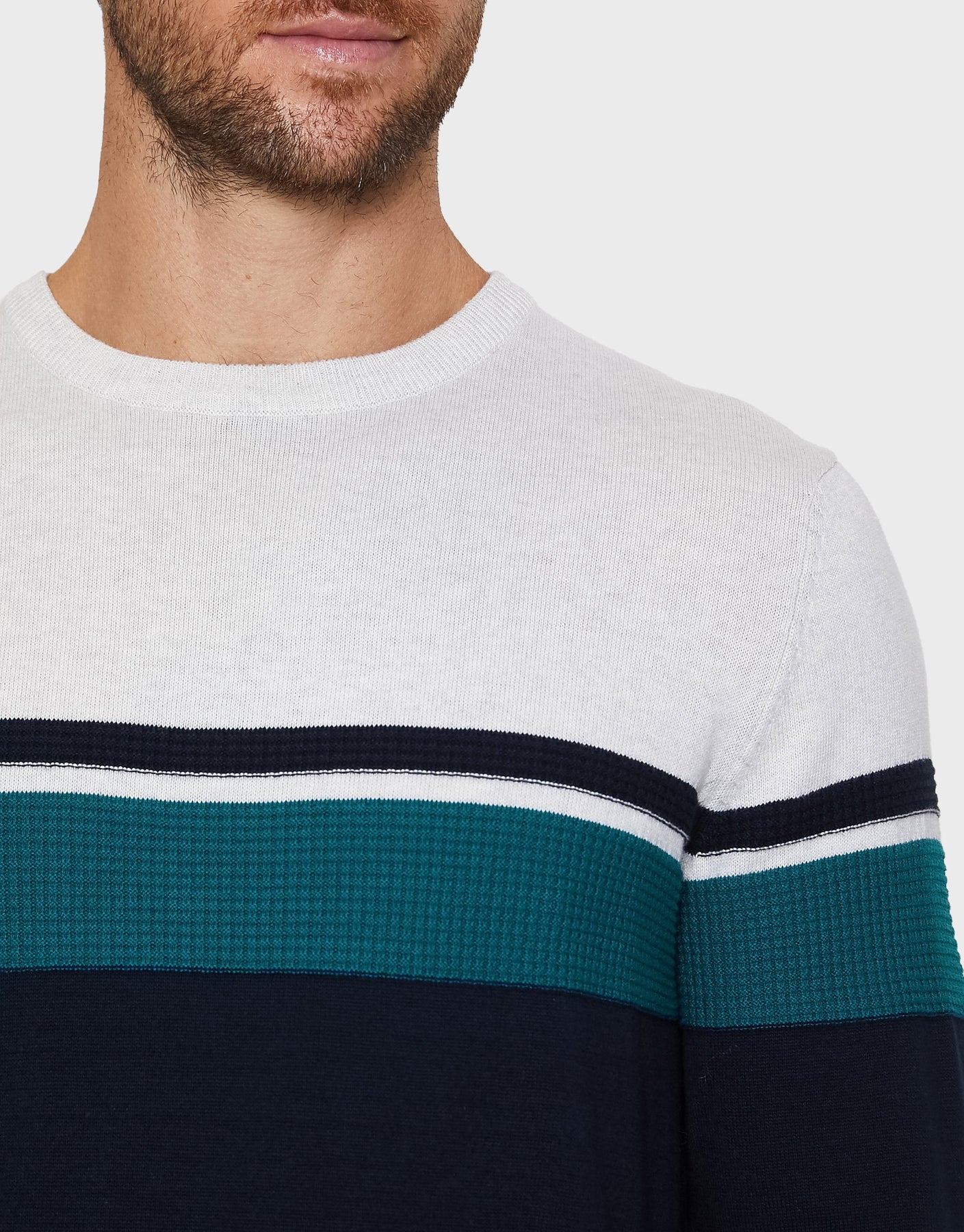 With a crew neck and cut in a regular fit, our jumper has ribbed cuffs and hem, colourblock stripe with textured detail to the chest. Finished with our signature woven Threadbare tab to hem.