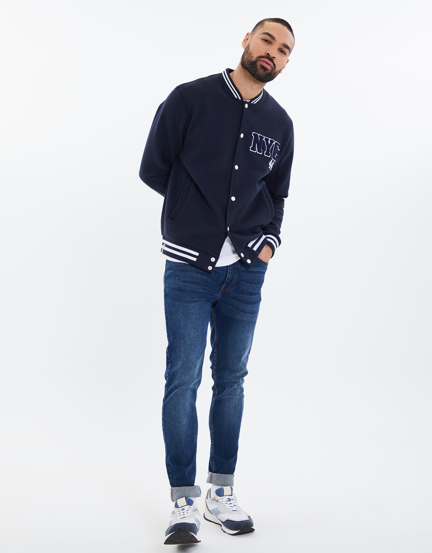 With varsity detailing to the chest and stripe tipping detail to the ribbed collar, cuffs and hem, this fleece-lined jacket is a casual upgrade of the traditional bomber style. The dropped shoulder and easy fit make it a great layer to add effortless cool to any outfit.